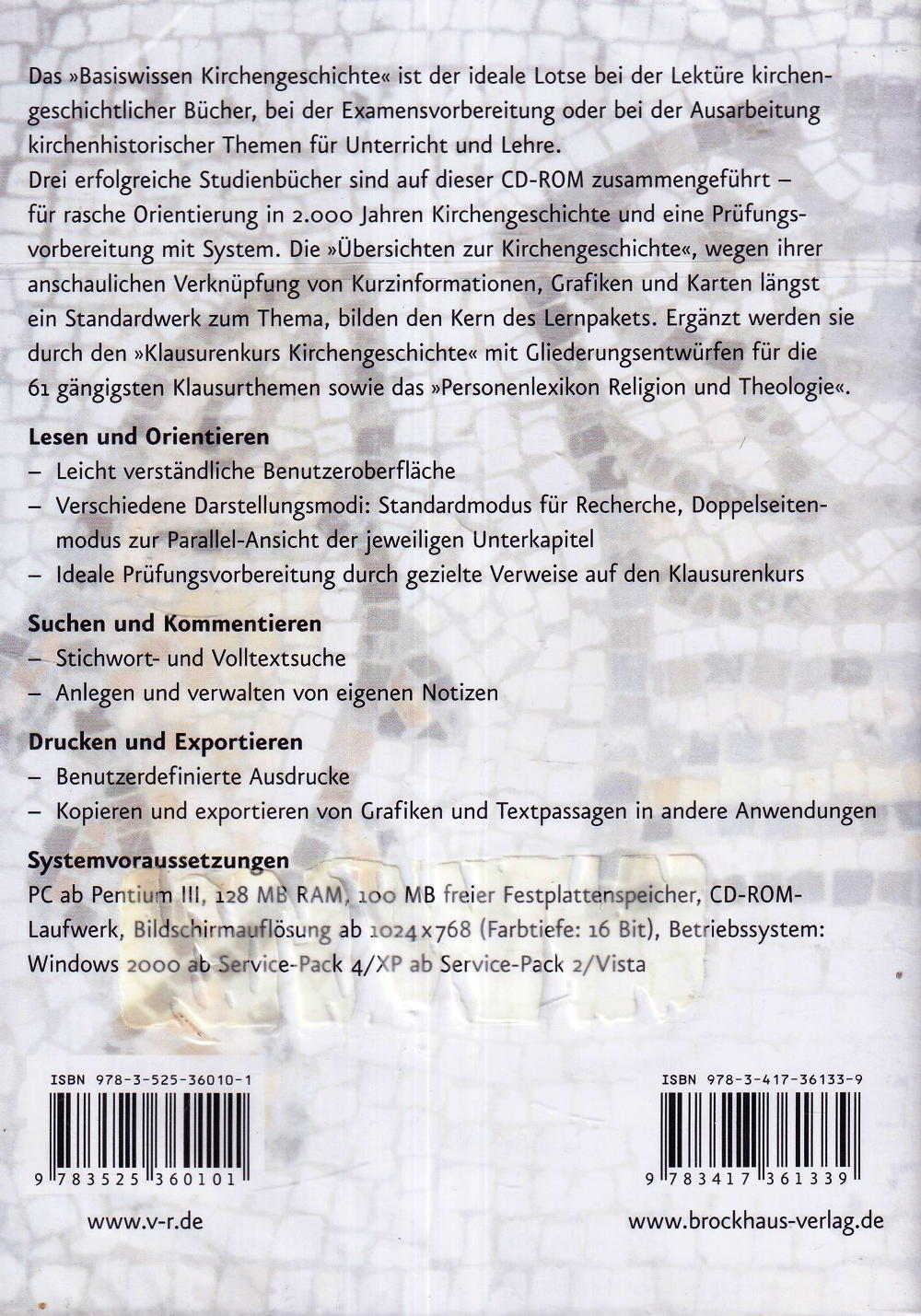 Drei erfolgreiche Studienbücher sind hier auf einer CD-ROM zusammengeführt - für rasche Orientierung in 2000 Jahren Kirchengeschichte und eine Prüfungsvorbereitung mit System. Die Übersichten zur Kirchengeschichte, wegen ihrer anschaulichen Verknüpfung von Kurzinformationen, Grafiken und Karten längst ein Standardwerk zum Thema, bilden den Kern des Lernpakets. Ergänzt werden sie durch den Klausurenkurs Kirchengeschichte mit Gliederungsentwürfen für die 61 gängigsten Klausurenthemen sowie das auf den neuesten Stand gebrachte Personenlexikon Religion und Theologie. So macht Kirchengeschichte Spass!