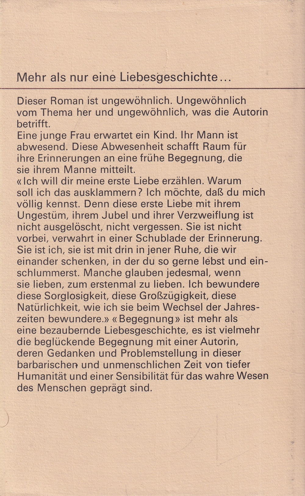 Sie ist ich, sie ist mit drin in jener Ruhe, die wir einander schenken, in der du so gerne lebst und einschlummerst. Manche glauben jedesmal, wenn sie lieben, zum erstenmal zu lieben. Ich bewundere diese Sorglosigkeit, diese Grosszügigkeit, diese Natürlichkeit, wie ich sie beim Wechsel der Jahreszeiten bewundere. » « Begegnung» ist mehr als eine bezaubernde Liebesgeschichte, es ist vielmehr die beglückende Begegnung mit einer Autorin, deren Gedanken und Problemstellung in dieser barbarischen und unmenschlichen Zeit von tiefer Humanität und einer Sensibilität für das wahre Wesen des Menschen geprägt sind.