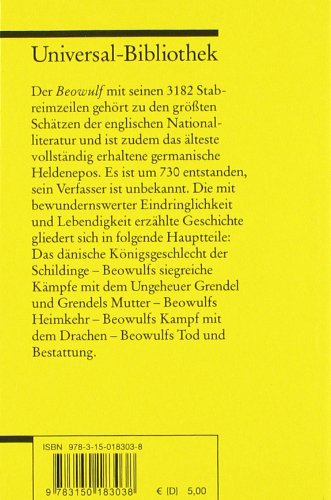 Der Beowulf mit seinen 3182 Stabreimzeilen gehört zu den grössten Schätzen der englischen Nationalliteratur und ist zudem das älteste vollständig erhaltene germanische Heldenepos. Es ist um 730 entstanden, sein Verfasser ist unbekannt. Die mit bewundernswerter Eindringlichkeit und Lebendigkeit erzählte Geschichte gliedert sich in folgende Hauptteile:
