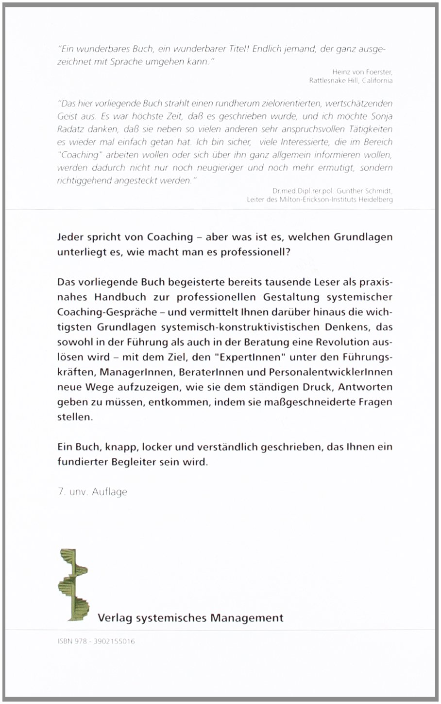 Das vorliegende Buch begeisterte bereits mehr als 45-tausend Leser als praxisnahes Handbuch zur professionellen Gestaltung systemischer Coaching-Gespräche - und vermittelt Ihnen darüber hinaus die wichtigsten Grundlagen systemisch-konstruktivistischen Denkens, das sowohl in der Führung als auch in der Beratung eine Revolution auslösen wird - mit dem Ziel, den ExpertInnen unter den Führungskräften, ManagerInnen, BeraterInnen und PersonalentwicklerInnen neue Wege aufzuzeigen, wie sie dem ständigen Druck, Antworten geben zu müssen, entkommen, indem sie massgeschneiderte Fragen stellen.