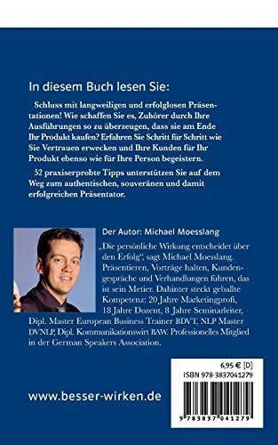 Schluss mit langweiligen und erfolglosen Präsen-tationen! Wie schaffen Sie es, Zuhörer durch Ihre Ausführungen so zu überzeugen, dass sie am Ende Ihr Produkt kaufen? Erfahren Sie Schritt für Schritt wie Sie Vertrauen erwecken und Ihre Kunden für Ihr Produkt ebenso wie für Ihre Person begeistern. 52 praxiserprobte Tipps unterstützen Sie auf dem Weg zum authentischen, souveränen und damit erfolgreichen Präsentator.