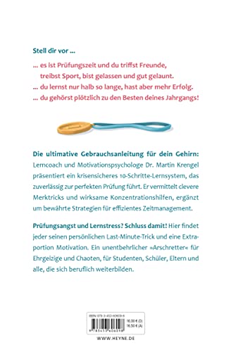 Schluss mit Prüfungsangst und Lernschwierigkeiten! Lerncoach und Motivationspsychologe Dr. Martin Krengel präsentiert ein krisensicheres 10-Schritte-Lernsystem, das zuverlässig zur perfekten Prüfung führt. Er vermittelt clevere Merktricks und wirksame Konzentrationshilfen, ergänzt um bewährte Strategien für effizientes Zeitmanagement. Wie lernt man, die richtigen Schwerpunkte zu setzen, Inhalte schneller zu erfassen und fest zu verankern? Wie lässt sich Prüfungsangst überwinden?