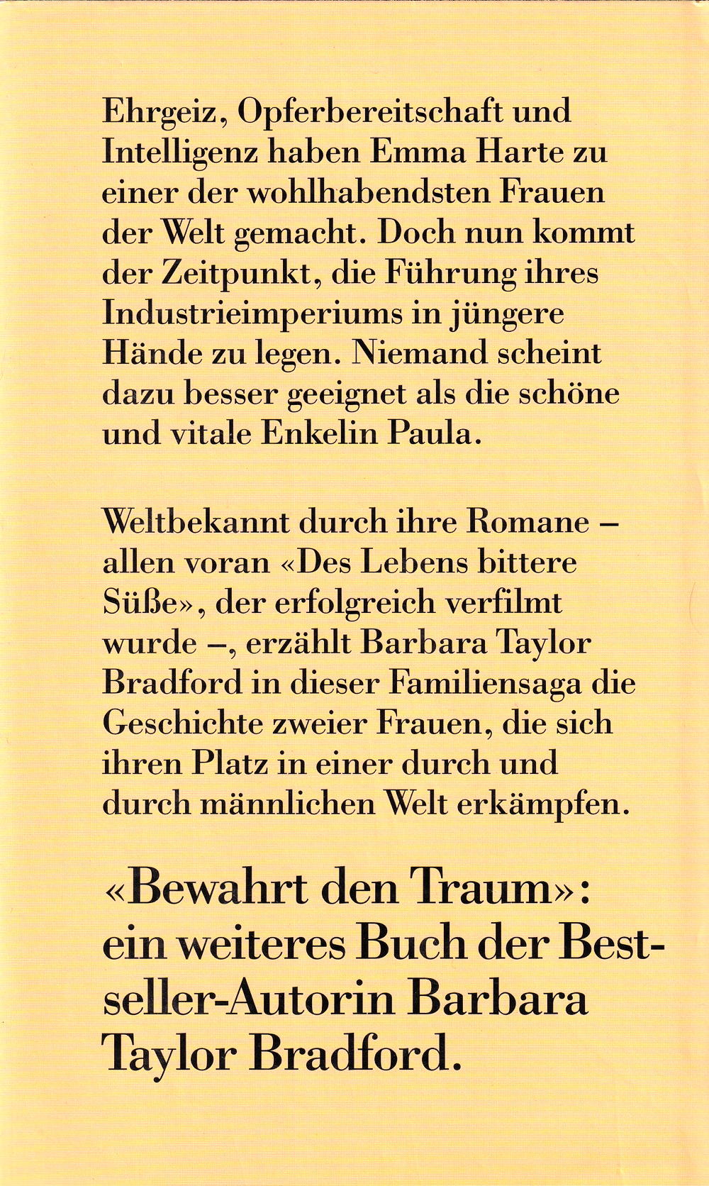 Ehrgeiz, Opferbereitschaft und Intelligenz haben Emma Harte einer der wohlhabendsten Frauen zu der Welt gemacht. Doch nun kommt der Zeitpunkt, die Führung ihres Industrieimperiums in jüngere Hände zu legen. Niemand scheint dazu besser geeignet als die schöne und vitale Enkelin Paula Weltbekannt durch ihre Romane allen voran Des Lebens bittere Süsse», der erfolgreich verfilmt wurde -, erzählt Barbara Taylor Bradford in dieser Familiensaga die Geschichte zweier Frauen, die sich ihren Platz in einer durch und durch männlichen Welt erkämpfen.