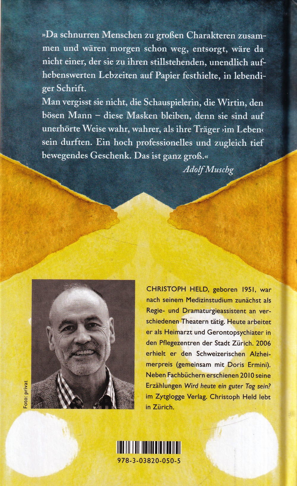 Christoph Held, geboren 1951, war nach seinem Medizinstudium zunächst als Regie- und Dramaturgieassistent an verschiedenen Theatern. Heute arbeitet er als Heimarzt und Gerontopsychiater in den Pflegezentren der Stadt Zürich. 2006 erhielt er den Schweizerischen Alzheimerpreis (gemeinsam mit Doris Ermini). Neben Fachbüchern erschienen 2010 seine Erzählungen Wird heute ein guter Tag sein im Zytglogge Verlag.