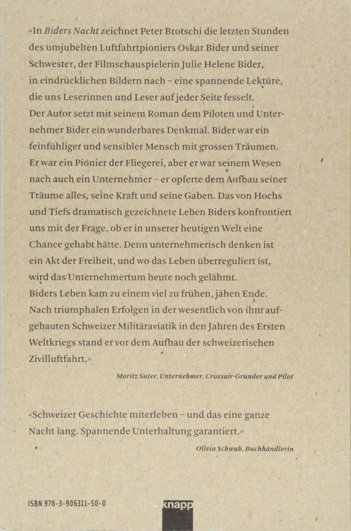Peter Brotschi verknüpft geschickt die historischen Gegebenheiten aus der Gründungszeit der Schweizer Luftfahrt mit einer spannenden fiktiven Handlung, die an den heute noch existierenden Originalschauplätzen in Zürich und Dübendorf spielt. Das Buch holt eine legendäre Nacht zurück in die Gegenwart. Satz für Satz ein spannendes, lehrreiches und berührendes Lesevergnügen.