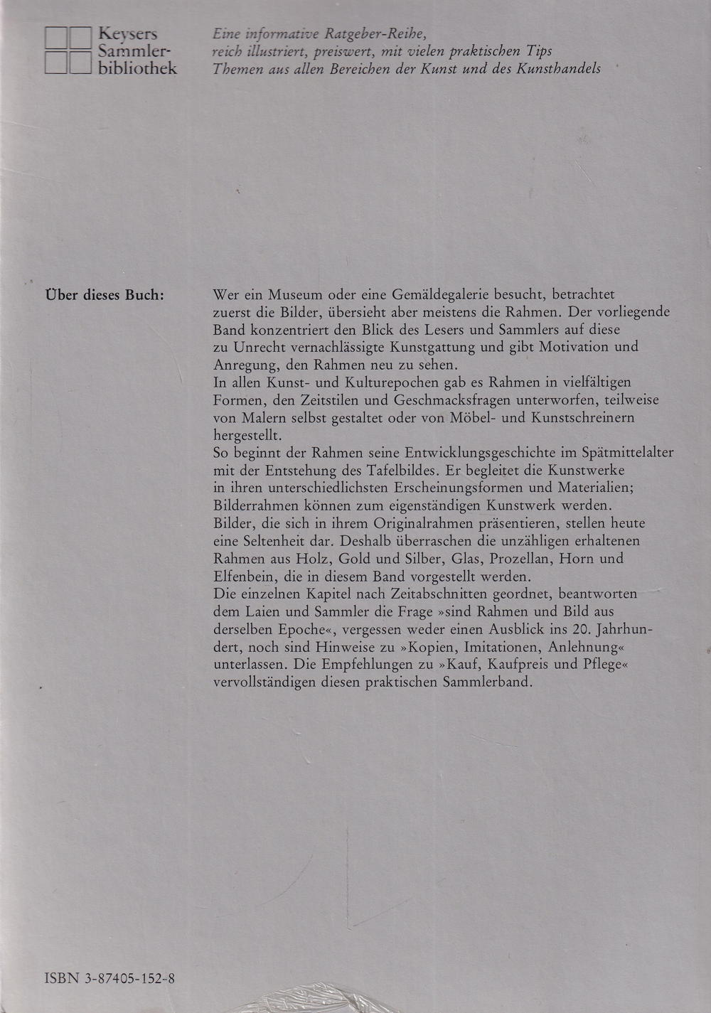 Die einzelnen Kapitel nach Zeitabschnitten geordnet, beantworten dem Laien und Sammler die Frage »sind Rahmen und Bild aus derselben Epoche«, vergessen weder einen Ausblick ins 20. Jahrhundert, noch sind Hinweise zu »Kopien, Imitationen, Anlehnung« unterlassen. Die Empfehlungen zu »Kauf, Kaufpreis und Pflege« vervollständigen diesen praktischen Sammlerband.