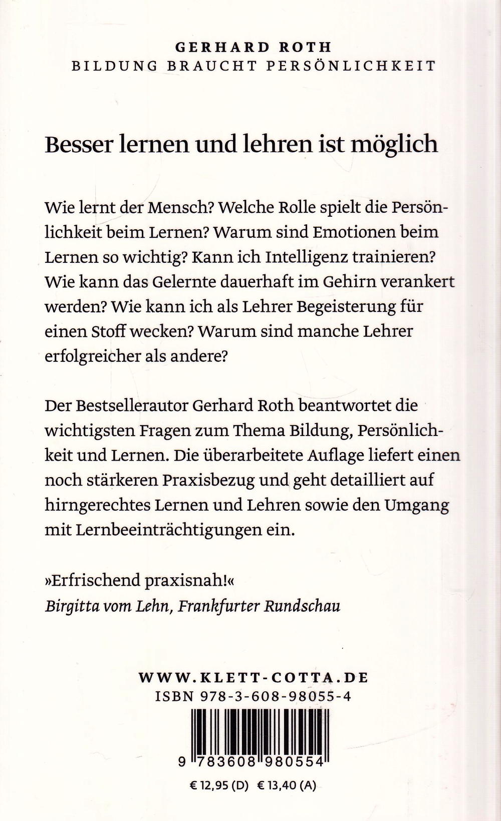 »Gerhard Roth - der wichtigste lebende deutschsprachige Naturwissenschaftler« Cicero »Roth öffnet das Feld des Lernens also ganz weit. Nach der Lektüre des Buches möchte man eine Revolution des Selbstverständlichen ausrufen.« Reinhard Kahl, Zeit Literatur »Erfrischend praxisnah!« Birgitta vom Lehn, Frankfurter RundschauDer Bestsellerautor Gerhard Roth beantwortet die wichtigsten Fragen zu den Themen Bildung, Persönlichkeit und Lernen. Die überarbeitete Auflage liefert einen noch besseren Praxisbezug und geht verstärkt auf Lernfaktoren ein, wie die Bildungsnähe des Elternhauses, und auf die Anfänge erfolgreicher Bildung im Kindesalter.
