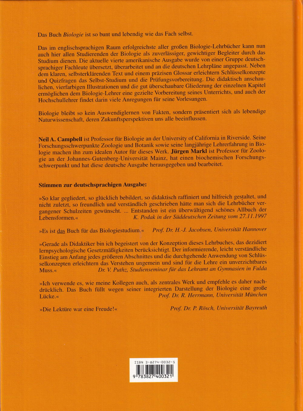 Dass Spektrum die vierte englische Ausgabe übersetzt und mit Hilfe zahlreicher deutschsprachiger Dozenten dieses Biologie-Lehrbuch überarbeitet hat, garantiert, dass dieses Buch jeden Biologie-Studenten als zuverlässigen, gewichtigen Begleiter durch das Studium führen kann. Merksätze und Fragen zur Selbst-Kontrolle erleichtern neben dem klaren, selbsterklärenden Text mit präzisem Glossar das Selbst-Studium und die Prüfungsvorbereitungen. Die didaktisch anschaulichen, vierfarbigen Illustrationen und die gut überschaubare Gliederung der Texte ermöglichen dem Biologie-Lehrer wie auch dem Biologie-Dozenten die gezielte Vorbereitung auf Unterricht und Vorlesungen. Das Lehrbuch "Biologie" veranschaulicht die komplette Biologie mit all ihren Teilfächern - Biochemie, Zellbiologie, Genetik, Evolution, Biodiversität, Botanik, Zoologie und Ökologie - farbig und lebendig. Renommierte Wissenschaftler erzählen von ihrem Weg zum Forscher, in Boxen erfährt der Leser, welche Methoden den wissenschaftlichen Erkenntnissen zugrundeliegen. Biologie bleibt so nicht das Verinnerlichen von Fakten, sondern eine lebendige Wissenschaft mit Zukunftsperspektive.