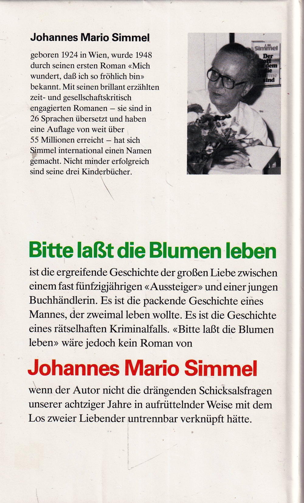 Bitte lasst die Blumen leben ist die ergreifende Geschichte der grossen Liebe zwischen einem fast fünfzigjährigen «Aussteiger» und einer jungen Buchhändlerin. Es ist die packende Geschichte eines Mannes, der zweimal leben wollte. Es ist die Geschichte eines rätselhaften Kriminalfalls. «Bitte lasst die Blumen leben» wäre jedoch kein Roman von Johannes Mario Simmel wenn der Autor nicht die drängenden Schicksalsfragen unserer achtziger Jahre in aufrüttelnder Weise mit dem Los zweier Liebender untrennbar verknüpft hätte.