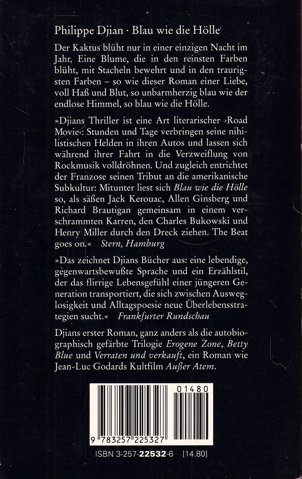 »Djians Thriller ist eine Art literarischer »Road Movie: Stunden und Tage verbringen seine nihilistischen Helden in ihren Autos und lassen sich während ihrer Fahrt in die Verzweiflung von Rockmusik volldröhnen. Und zugleich entrichtet der Franzose seinen Tribut an die amerikanische Subkultur: Mitunter liest sich Blau wie die Hölle als sässen Jack Kerouac, Allen Ginsberg und Richard Brautigan gemeinsam in einem verschrammten Karren, den Charles Bukowski und Henry Miller durch den Dreck ziehen. The Beat Stern, Hamburg SO, goes on. «