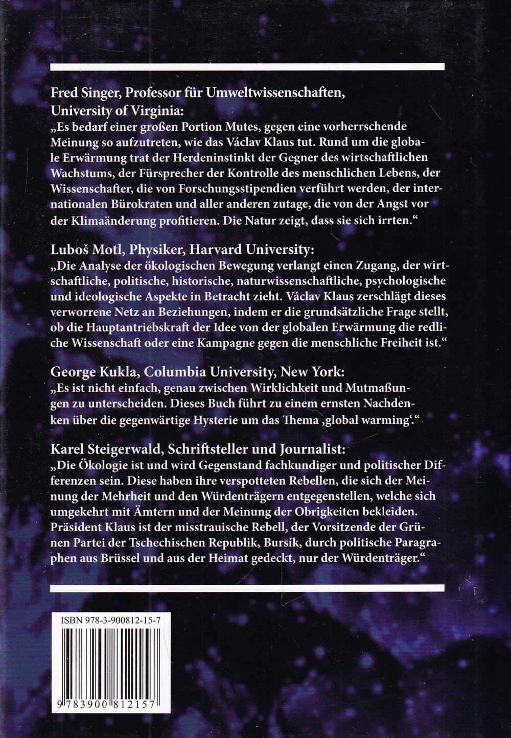 In diesem Buch kommt Klaus immer wieder auf die Freiheit des Menschen zurück, die er durch den „Environmentalismus“ bedroht sieht. „Diese ideologische Strömung wurde in der Gegenwart zur dominanten Alternative gegenüber den konsequent und primär an der Freiheit des Menschen orientierten Ideologien.“ Václav Klaus hat die Vergabe des Friedensnobelpreises an den ehemaligen US-Vizepräsidenten Al Gore heftig kritisiert. Er sehe keinen Zusammenhang zwischen dem Weltfrieden und den Aktivitäten Gores, so Klaus. Seine Kritik über Al Gores oscargekrönten Film „Eine unbequeme Wahrheit“ und dessen Aktivitäten bringt Klaus auch im Buch sehr klar zum Ausdruck.Das Buch von Václav Klaus ist als ein Standardwerk in der gegenwärtigen Umweltdiskussion anzusehen. Egal ob Befürworter oder Gegner, seine andere Sicht der Dinge, als die der bislang propagierten, bringt in jedem Fall für alle einen Ausgleich in der Auseinandersetzung mit dem Thema Umwelt, der schon lange notwendig war.Ein spannendes, hoch politisches Buch, das einerseits entlarvend und anderseits nachdenklich stimmt. Im Ganzen auch ein Beitrag zur Demokratie-Diskussion, die im Zusammenhang mit Umwelt oft ausser Acht gelassen wird.