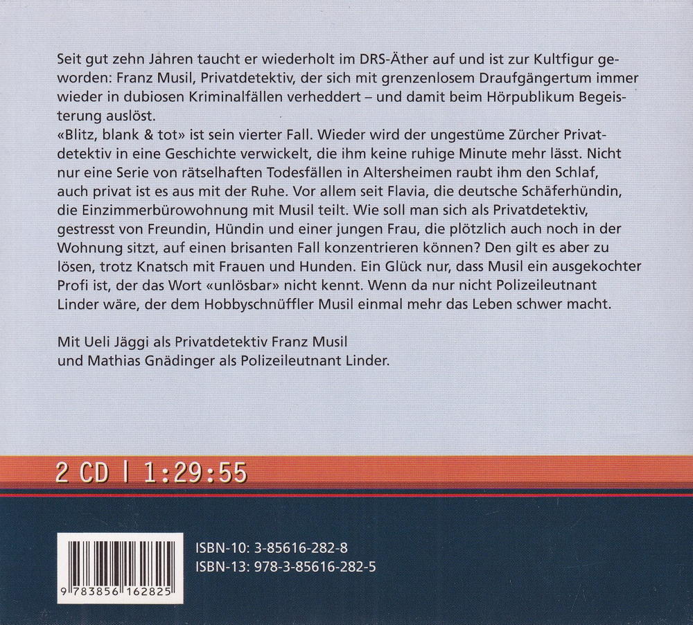Seit gut zehn Jahren taucht er wiederholt im DRS-Äther auf und ist zur Kultfigur geworden: Franz Musil, Privatdetektiv, der sich mit grenzenlosem Draufgängertum immer wieder in dubiosen Kriminalfällen verheddert - und damit beim Hörpublikum Begeisterung auslöst. «Blitz, blank & tot» ist sein vierter Fall. Wieder wird der ungestüme Zürcher Privatdetektiv in eine Geschichte verwickelt, die ihm keine ruhige Minute mehr lässt. Nicht nur eine Serie von rätselhaften Todesfällen in Altersheimen raubt ihm den Schlaf, auch privat ist es aus mit der Ruhe. Vor allem seit Flavia, die deutsche Schäferhündin, die Einzimmerbürowohnung mit Musil teilt. Wie soll man sich als Privatdetektiv, gestresst von Freundin, Hündin und einer jungen Frau, die plötzlich auch noch in der Wohnung sitzt, auf einen brisanten Fall konzentrieren können? Den gilt es aber zu lösen, trotz Knatsch mit Frauen und Hunden. Ein Glück nur, dass Musil ein ausgekochter Profi ist, der das Wort «unlösbar» nicht kennt. Wenn da nur nicht Polizeileutnant Linder wäre, der dem Hobbyschnüffler Musil einmal mehr das Leben schwer macht.