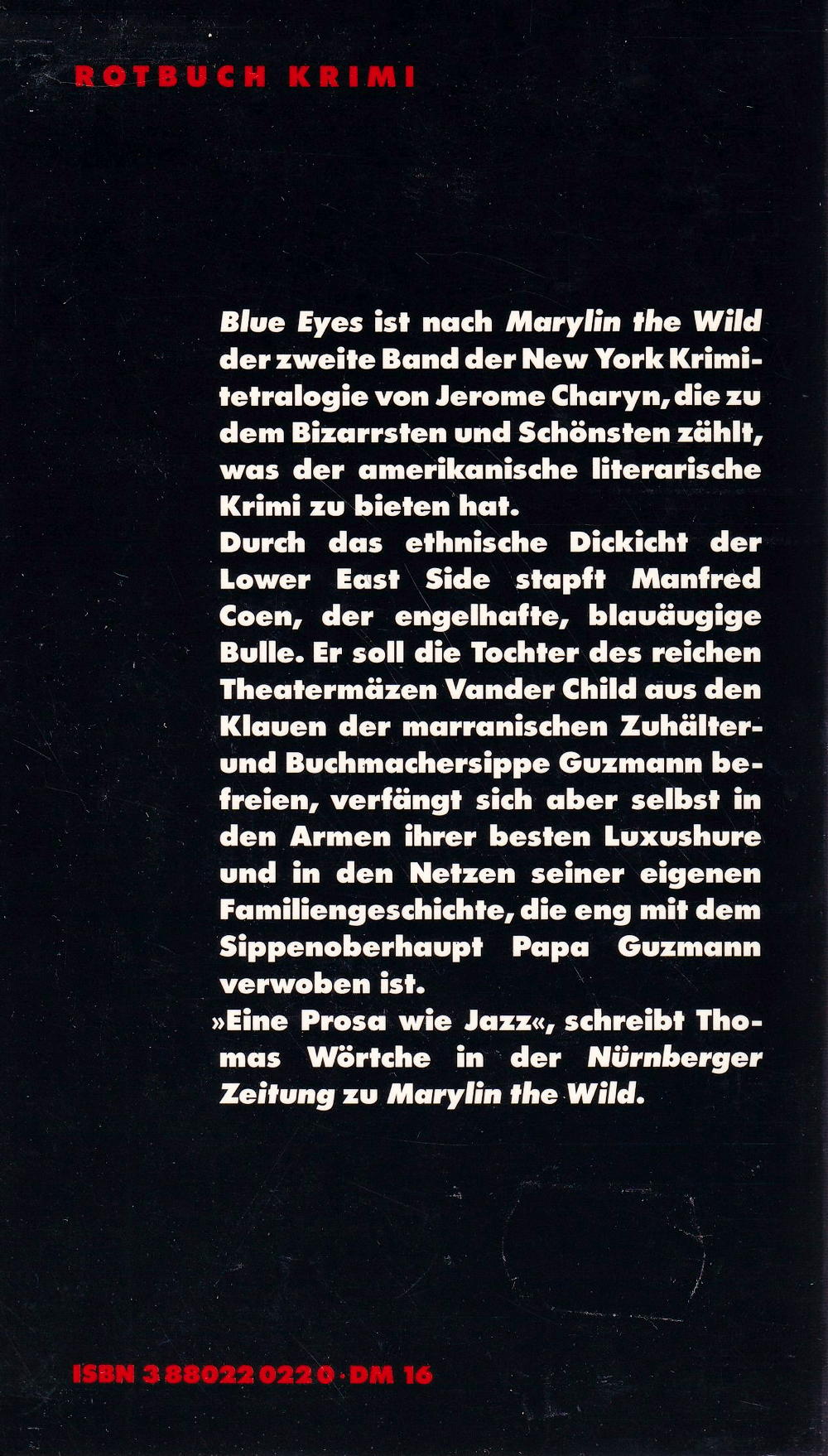 Blue Eyes ist nach Marylin the Wild der zweite Band der New York Krimitetralogie von Jerome Charyn, die zu dem Bizarrsten und Schönsten zählt, was der amerikanische literarische Krimi zu bieten hat.