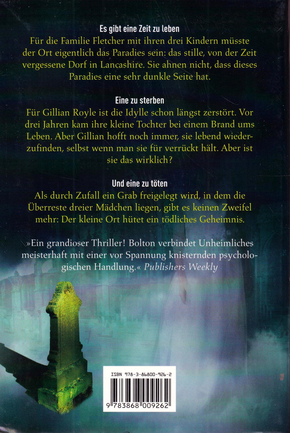 Es gibt eine Zeit zu leben Für die Familie Fletcher mit ihren drei Kindern müsste der Ort eigentlich das Paradies sein: das stille, von der Zeit vergessene Dorf in Lancashire. Sie ahnen nicht, dass dieses Paradies eine sehr dunkle Seite hat. Eine zu sterben Für Gillian Royle ist die Idylle schon längst zerstört. Vor drei Jahren kam ihre kleine Tochter bei einem Brand ums Leben. Aber Gillian hofft noch immer, sie lebend wiederzufinden, selbst wenn man sie für verrückt hält. Aber ist sie das wirklich? Und eine zu töten Als durch Zufall ein Grab freigelegt wird, in dem die Überreste dreier Mädchen liegen, gibt es keinen Zweifel mehr: Der kleine Ort hütet ein tödliches Geheimnis.