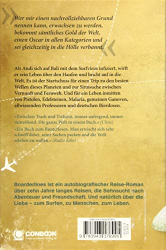 Boarderlines ist ein autobiografischer Reise-Roman über die schönsten Wellen dieses Planeten, die Sinnsuche und die Sehnsucht nach Abenteuer. Über ein Leben zwischen Pistolen, Edelsteinen, Malaria, einer entlegenen Insel, gemeinen Ganoven, allwissenden Professoren, und deutschen Bierdosen. Über Freundschaft und natürlich über die Liebe – zum Surfen, zu Menschen, zum Leben.