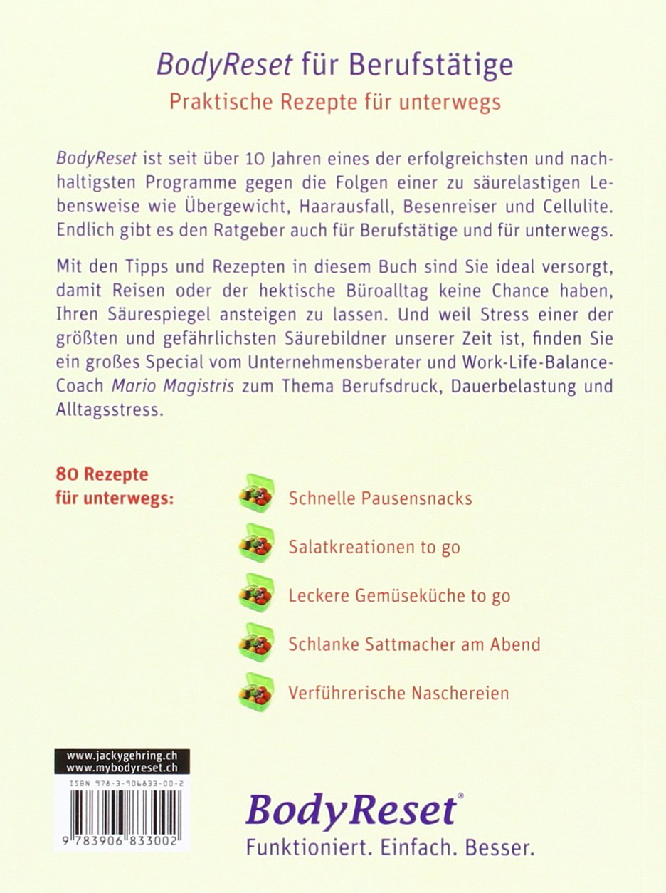 BodyReset ist seit über 10 Jahren eines der erfolgreichsten und nachhaltigsten Programme gegen die Folgen einer säurelastigen Lebensweise wie Übergewicht, Haarausfall, Besenreiser und Cellulite. Endlich gibt es den Ratgeber auch für Berufstätige und für unterwegs.