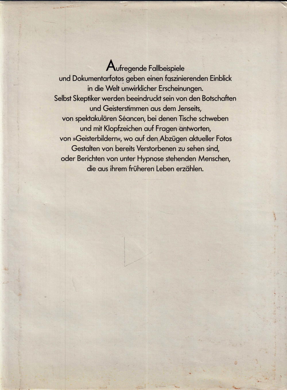 Selbst Skeptiker werden beeindruckt sein von den Botschaften und Geisterstimmen aus dem Jenseits, von spektakulären Séancen, bei denen Tische schweben und mit Klopfzeichen auf Fragen antworten, von »Geisterbildern«, wo auf den Abzügen aktueller Fotos Gestalten von bereits Verstorbenen zu sehen sind, oder Berichten von unter Hypnose stehenden Menschen, die aus ihrem früheren Leben erzählen.