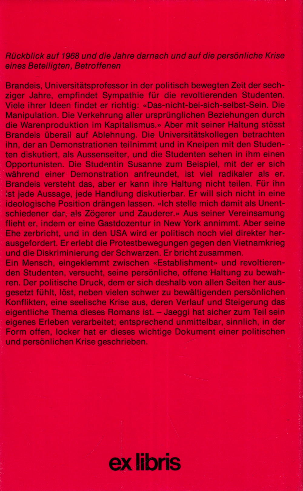 Ein Mensch, eingeklemmt zwischen «Establishment» und revoltierenden Studenten, versucht, seine persönliche, offene Haltung zu bewahren. Der politische Druck, dem er sich deshalb von allen Seiten her ausgesetzt fühlt, löst, neben vielen schwer zu bewältigenden persönlichen Konflikten, eine seelische Krise aus, deren Verlauf und Steigerung das eigentliche Thema dieses Romans ist. - Jaeggi hat sicher zum Teil sein eigenes Erleben verarbeitet; entsprechend unmittelbar, sinnlich, in der Form offen, locker hat er dieses wichtige Dokument einer politischen und persönlichen Krise geschrieben.