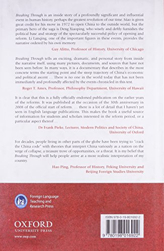 Breaking Through is an inside story of a profoundly significant and influential event in human history, perhaps the greatest revolution of our time. Mao is given great credit for his move in 1972 to open China to the outside world, but the primary hero of the saga is Deng Xiaoping, who wisely and deftly furnishes the political base and strategy of the spectacularly successful policy of opening and reform. Li Lanqing, one of the important figures in these events, provides the narrative ordered by his own memory.