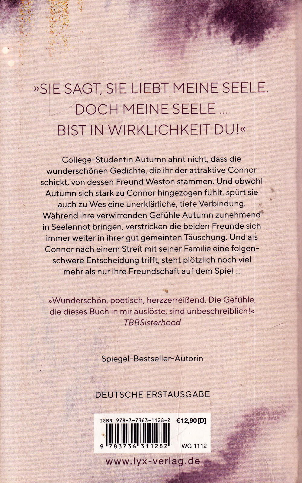 College-Studentin Autumn ahnt nicht, dass die wunderschönen Gedichte, die ihr der attraktive Connor schickt, von dessen Freund Weston stammen. Und obwohl Autumn sich stark zu Connor hingezogen fühlt, spürt sie auch zu Wes eine unerklärliche, tiefe Verbindung. Während ihre verwirrenden Gefühle Autumn zunehmend in Seelennot bringen, verstricken die beiden Freunde sich immer weiter in ihrer gut gemeinten Täuschung. Und als Connor nach einem Streit mit seiner Familie eine folgenschwere Entscheidung trifft, steht plötzlich noch viel mehr als nur ihre Freundschaft auf dem Spiel ...