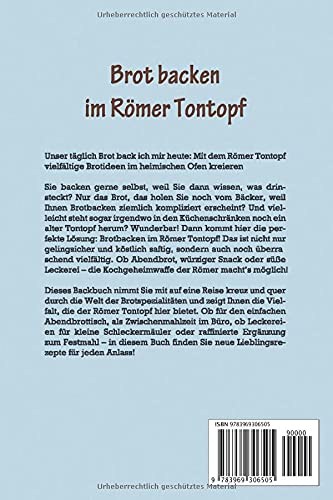 Wässern, reinigen und bitte kein Kälteschock: Worauf Sie im Umgang mit Ihrem Römer Tontopf achten sollten, um lange Freude daran zu haben. Für den kleinen Hunger zwischendurch: Probieren Sie sich durch würzige Snacks wie Schinkenspeckbrot, Pizza-Brot, buntes Pesto-Brot oder gar Kaffee-Brot und geniessen Sie das ganz besondere Tontopf-Aroma. Unser täglich Brot: Allseits beliebte Grundlagen am Abendbrottisch wie Vollkorn-Mischbrot, Kürbiskernbrot, Vollkorn-Toastbrot oder Schwarzbrot gibt es in Zukunft immer frisch und selbstgemacht. Und wenn es mal ein wenig ausgefallener sein darf: Joghurt-Möhren-Brot, Petersilie-Käse-Brot, Bärlauch-Brot oder Rosmarin-Tomaten-Brot bringen leckere Abwechslung auf den Tisch. Zum Nachtisch dann noch etwas Süsses: Verwöhnen Sie sich mit Rhabarber-Vanille-Zopfbrot, Butter-Zimt-Brot, Kokosnuss-Zopfbrot oder geniessen Sie sündig-süsses Nougat-Zopfbrot. Dieses Backbuch nimmt Sie mit auf eine Reise kreuz und quer durch die Welt der Brotspezialitäten und zeigt Ihnen die Vielfalt, die der Römer Tontopf hier bietet. Ob für den einfachen Abendbrottisch, als Zwischenmahlzeit im Büro, ob Leckereien für kleine Schleckermäuler oder raffinierte Ergänzung zum Festmahl – in diesem Buch finden Sie neue Lieblingsrezepte für jeden Anlass!