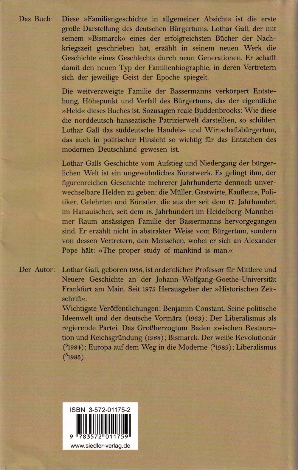 Die weitverzweigte Familie der Bassermanns verkörpert Entstehung, Höhepunkt und Verfall des Bürgertums, das der eigentliche »Held« dieses Buches ist. Sozusagen reale Buddenbrooks: Wie diese die norddeutsch-hanseatische Patrizierwelt darstellten, so schildert Lothar Gall das süddeutsche Handels- und Wirtschaftsbürgertum, das auch in politischer Hinsicht so wichtig für das Entstehen des modernen Deutschland gewesen ist.