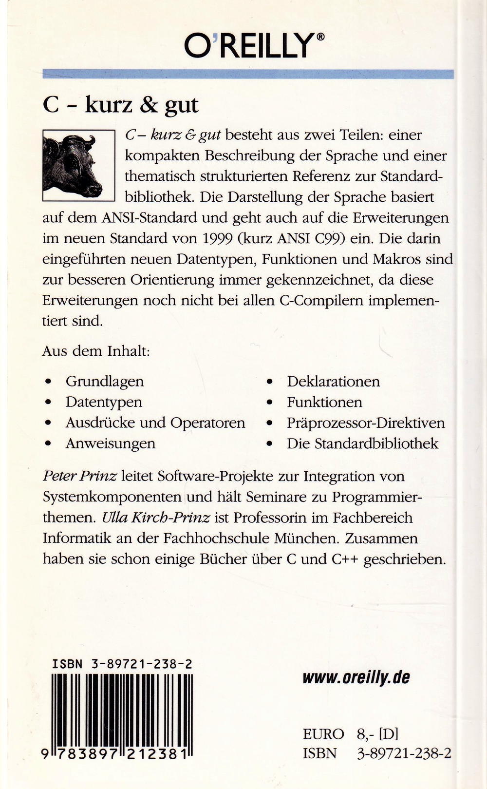 C- kurz & gut besteht aus zwei Teilen: einer kompakten Beschreibung der Sprache und einer thematisch strukturierten Referenz zur Standardbibliothek. Die Darstellung der Sprache basiert auf dem ANSI-Standard und geht auch auf die Erweiterungen im neuen Standard von 1999 (kurz ANSI C99) ein. Die darin eingeführten neuen Datentypen, Funktionen und Makros sind zur besseren Orientierung immer gekennzeichnet, da diese Erweiterungen noch nicht bei allen C-Compilern implementiert sind.