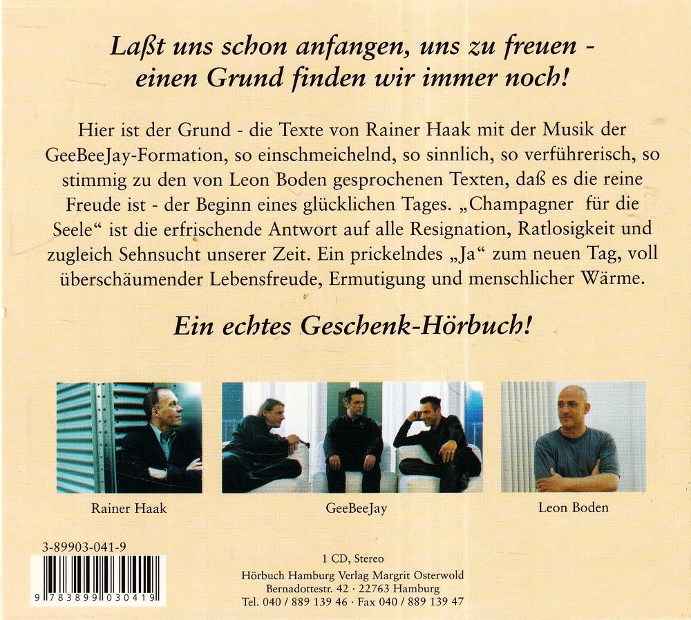 Hier ist der Grund die Texte von Rainer Haak mit der Musik der GeeBeeJay-Formation, so einschmeichelnd, so sinnlich, so verführerisch, so stimmig zu den von Leon Boden gesprochenen Texten, dass es die reine Freude ist - der Beginn eines glücklichen Tages. „Champagner für die Seele“ist die erfrischende Antwort auf alle Resignation, Ratlosigkeit und zugleich Sehnsucht unserer Zeit. Ein prickelndes „Ja“zum neuen Tag, voll überschäumender Lebensfreude, Ermutigung und menschlicher Wärme.