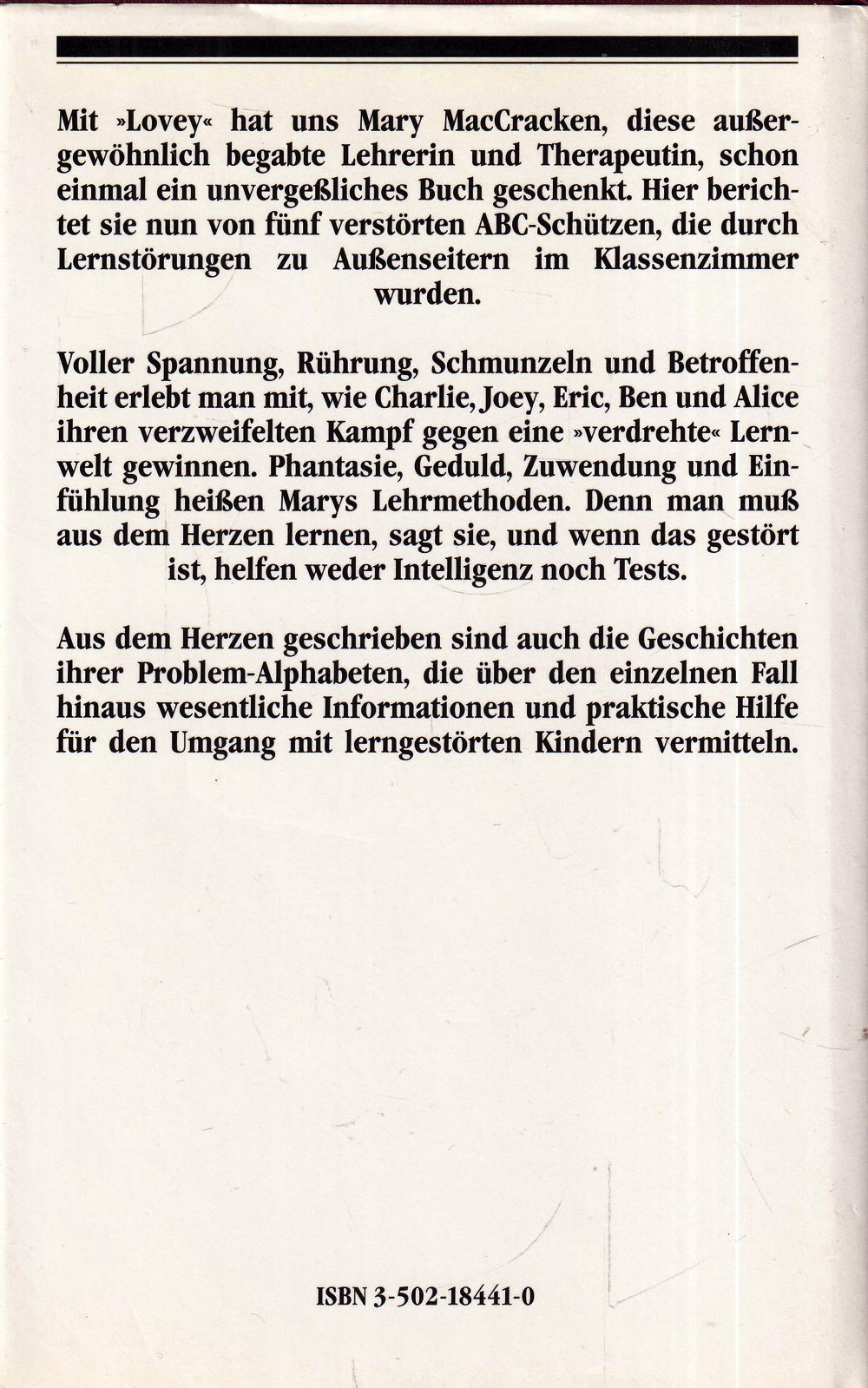 Mit »Lovey« hat uns Mary MacCracken, diese aussergewöhnlich begabte Lehrerin und Therapeutin, schon einmal ein unvergessliches Buch geschenkt. Hier berichtet sie nun von fünf verstörten ABC-Schützen, die durch Lernstörungen zu Aussenseitern im Klassenzimmer wurden.
