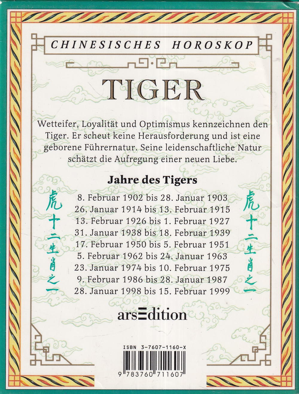 Wetteifer, Loyalität und Optimismus kennzeichnen den Tiger. Er scheut keine Herausforderung und ist eine geborene Führernatur. Seine leidenschaftliche Natur schätzt die Aufregung einer neuen Liebe.