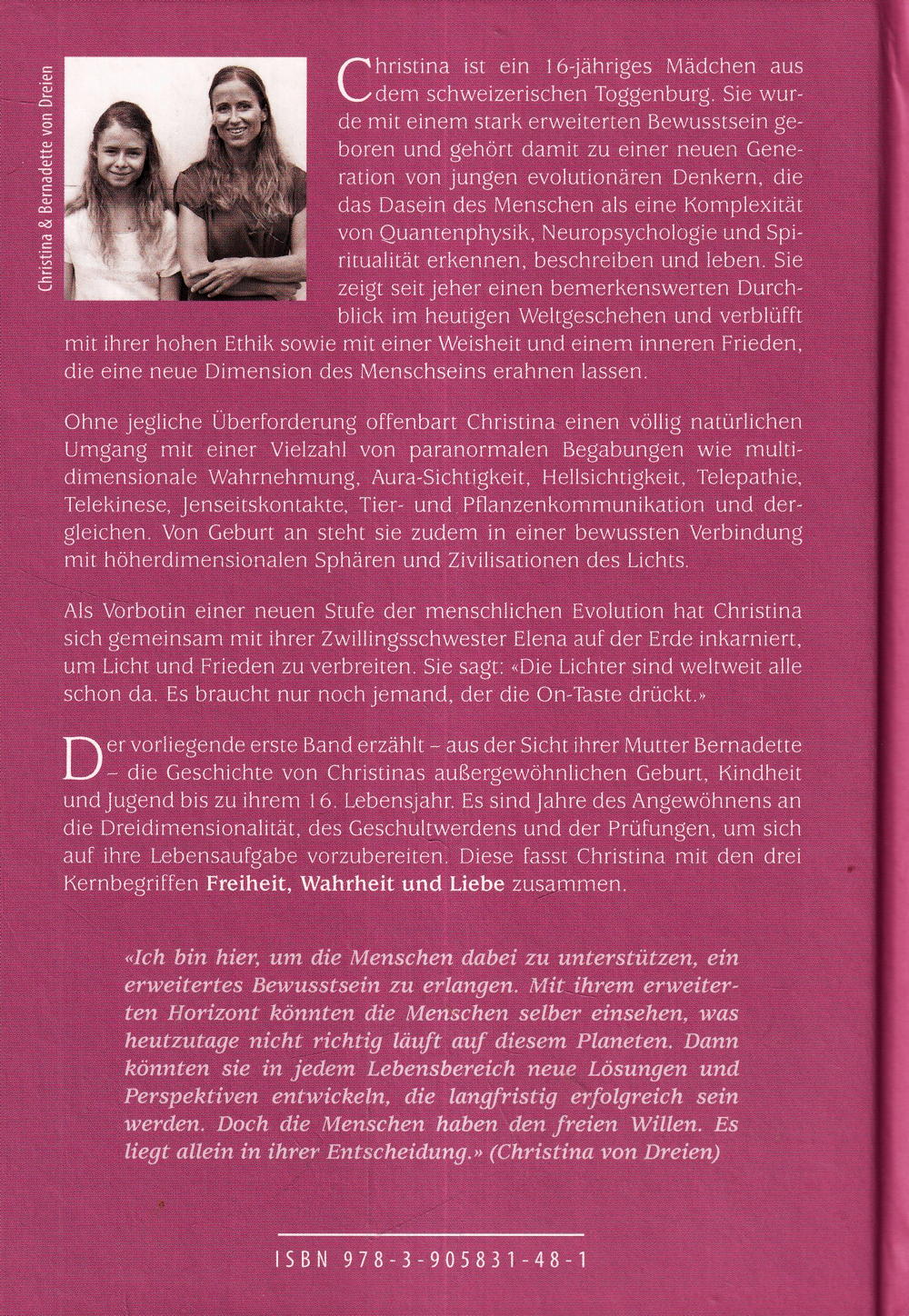 Band 1 erzählt - aus der Sicht ihrer Mutter Bernadette - die Geschichte von Christinas aussergewöhnlichen Geburt, Kindheit und Jugend bis zu ihrem 16. Lebensjahr. Es sind Jahre des Angewöhnens an die Dreidimensionalität, des Geschultwerdens und der Prüfungen, um sich auf ihre Lebensaufgabe vorzubereiten. Diese fasst Christina mit den drei Kernbegriffen Freiheit, Wahrheit und Liebe zusammen.