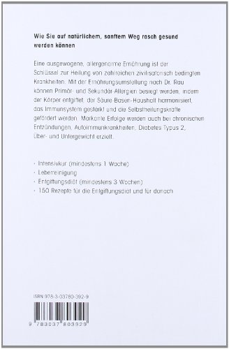 Eine ausgewogene, allergenarme Ernährung ist der Schlüssel zur Heilung von zahlreichen zivilisatorisch bedingten Krankheiten. Mit der Ernährungsumstellung nach Dr. Rau können Primär- und Sekundär-Allergien besiegt werden, indem der Körper entgiftet, der Säure-Basen-Haushalt harmonisiert, das Immunsystem gestärkt und die Selbstheilungskräfte gefördert werden. Markante Erfolge werden auch bei chronischen Entzündungen, Autoimmunkrankheiten, Diabetes Typus 2,