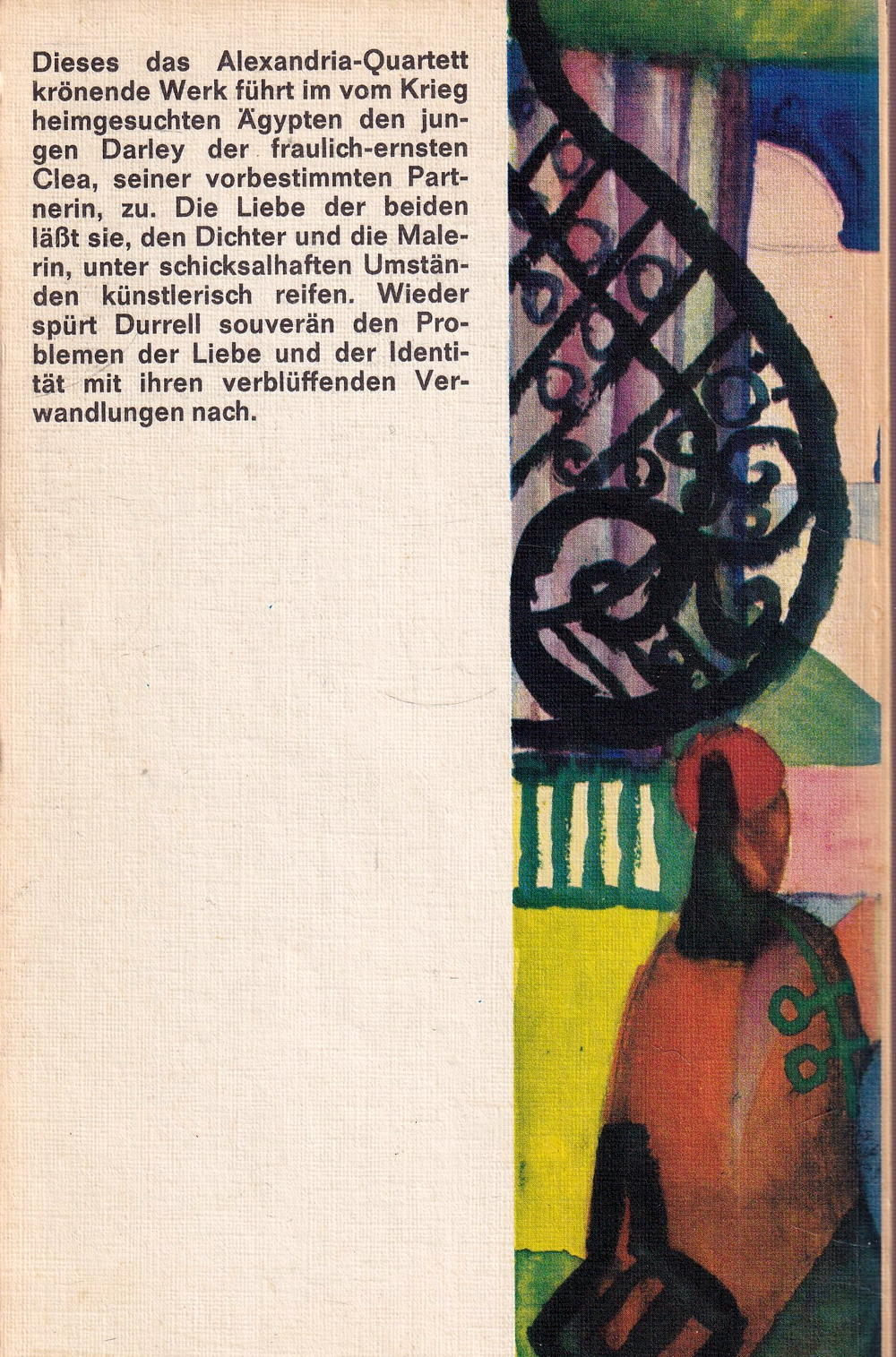 Dieses das Alexandria-Quartett krönende Werk führt im vom Krieg heimgesuchten Agypten den jungen Darley der fraulich-ernsten Clea, seiner vorbestimmten Partnerin, zu. Die Liebe der beiden lässt sie, den Dichter und die Malerin, unter schicksalhaften Umständen künstlerisch reifen. Wieder spürt Durrell souverän den Problemen der Liebe und der Identität mit ihren verblüffenden Verwandlungen nach.