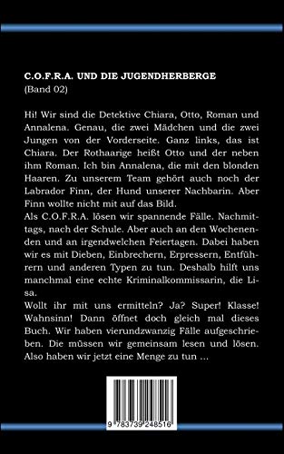 Hi! Wir sind die Detektive Chiara, Otto, Roman und Annalena. Genau, die zwei Mädchen und die zwei Jungen von der Vorderseite. Ganz links, das ist Chiara. Der Rothaarige heisst Otto und der neben ihm Roman. Ich bin Annalena, die mit den blonden Haaren. Zu unserem Team gehört auch noch der Labrador Finn, der Hund unserer Nachbarin. Aber Finn wollte nicht mit auf das Bild. Als C. O. F. R. A. lösen wir spannende Fälle. Nachmittags, nach der Schule. Aber auch an den Wochenenden und an irgendwelchen Feiertagen. Dabei haben wir es mit Dieben, Einbrechern, Erpressern, Entführern und anderen Typen zu tun. Deshalb hilft uns manchmal eine echte Kriminalkommissarin, die Lisa. Wollt ihr mit uns ermitteln? Ja? Super! Klasse! Wahnsinn! Dann öffnet doch gleich mal dieses Buch. Wir haben vierundzwanzig Fälle aufgeschrieben. Die müssen wir gemeinsam lesen und lösen. Also haben wir jetzt eine Menge zu tun…