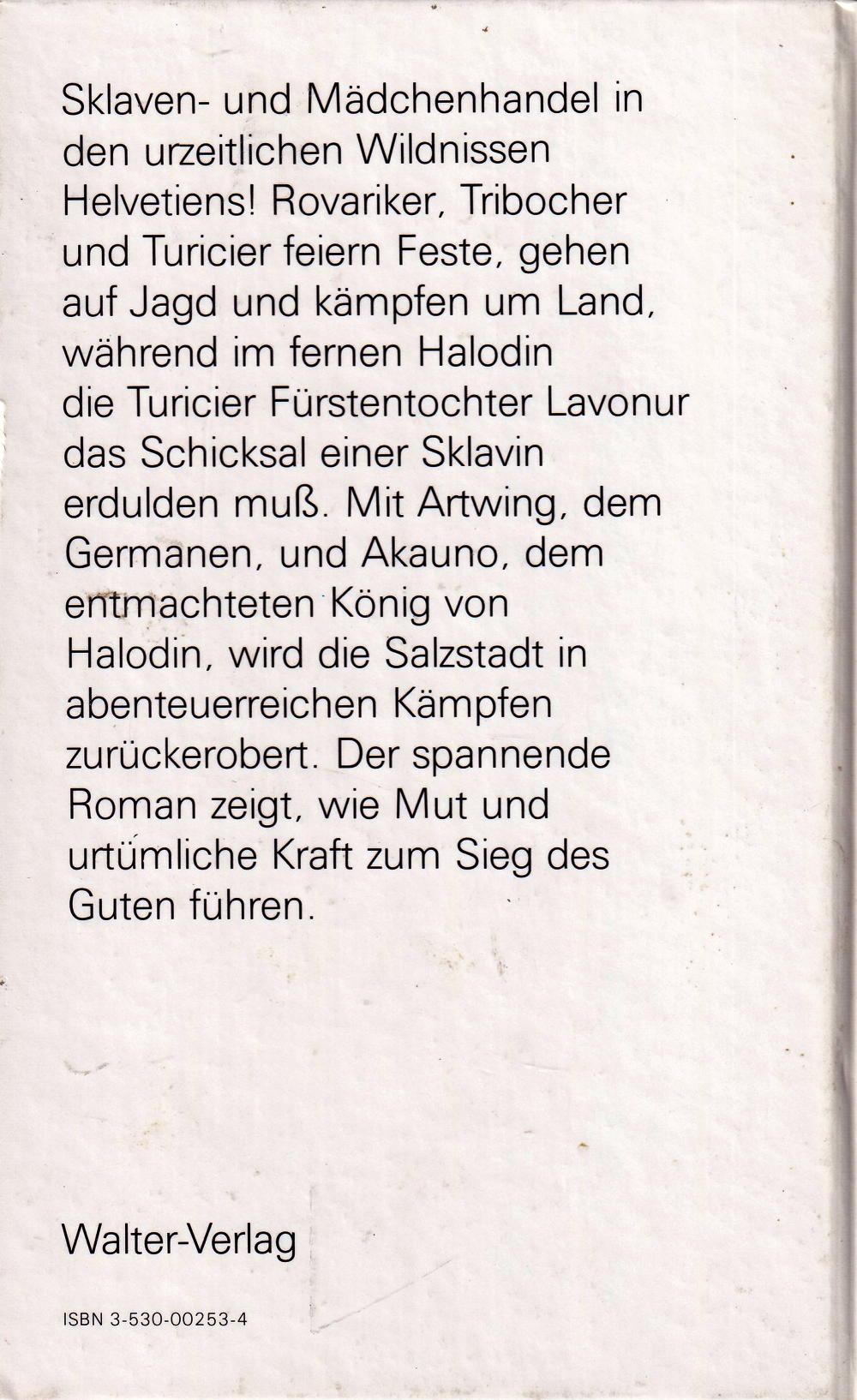 Sklaven- und Mädchenhandel in den urzeitlichen Wildnissen Helvetiens! Rovariker, Tribocher und Turicier feiern Feste, gehen auf Jagd und kämpfen um Land, während im fernen Halodin die Turicier Fürstentochter Lavonur das Schicksal einer Sklavin erdulden muss. Mit Artwing, dem Germanen, und Akauno, dem entmachteten König von Halodin, wird die Salzstadt in abenteuerreichen Kämpfen zurückerobert. Der spannende Roman zeigt, wie Mut und urtümliche Kraft zum Sieg des Guten führen.
