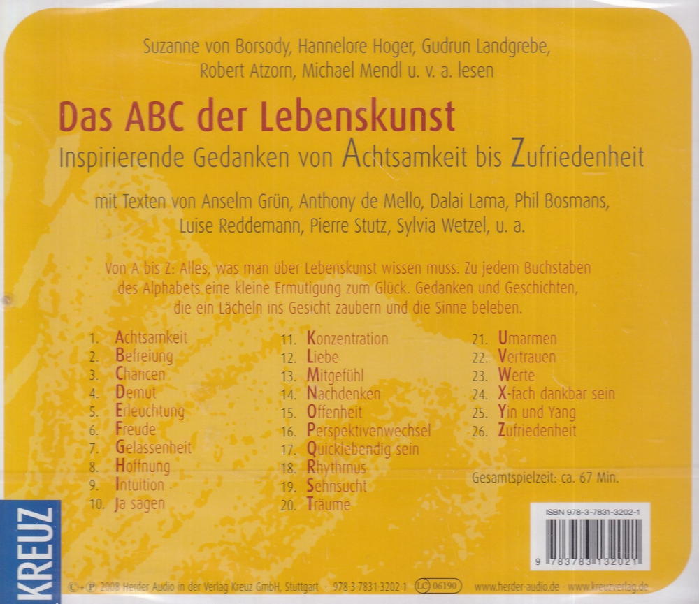 Von A bis Z: Alles, was man über Lebenskunst wissen muss. Zu jedem Buchstaben des Alphabets eine kleine Ermutigung zum Glück. Gedanken und Geschichten, die ein Lächeln ins Gesicht zaubern und die Sinne beleben.