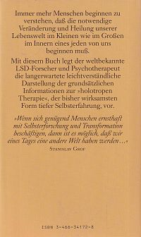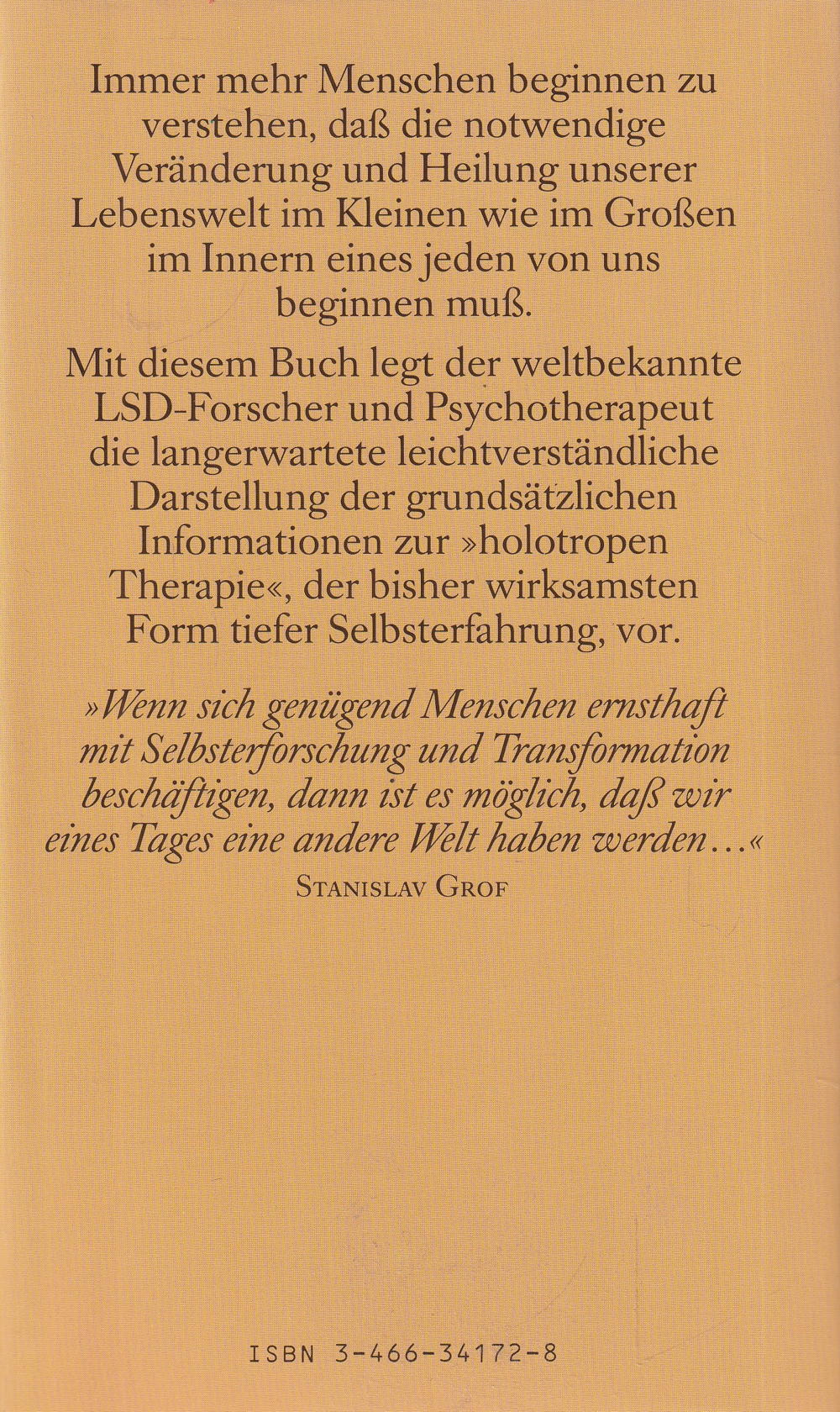Immer mehr Menschen beginnen zu verstehen, daß die notwendige Veränderung und Heilung unserer Lebenswelt im Inneren eines jeden von uns beginnen muß. Diese Veränderung ist nicht leicht. Grof hat auf Grund jahrelanger Forschungen eine Methode entwickelt, durch die der Klient mit der Unterstützung des Therapeuten die traumatischen Erfahrungen wiedererleben und in sein bewußtsein integrieren kann. Diese Therapie hat sich zur Heilung von tiefen seelischen Krisen bewährt und sich als hervorragender Weg zur Selbsterkenntnis erwiesen. In diesem Buch erklärt Grof die Grundlagen seiner Therapie, beschreibt, was in einer Sitzung passieren kann, und liefert Berichte von Leuten, die dabei außergewöhnliche Erfahrungen gemacht haben.
