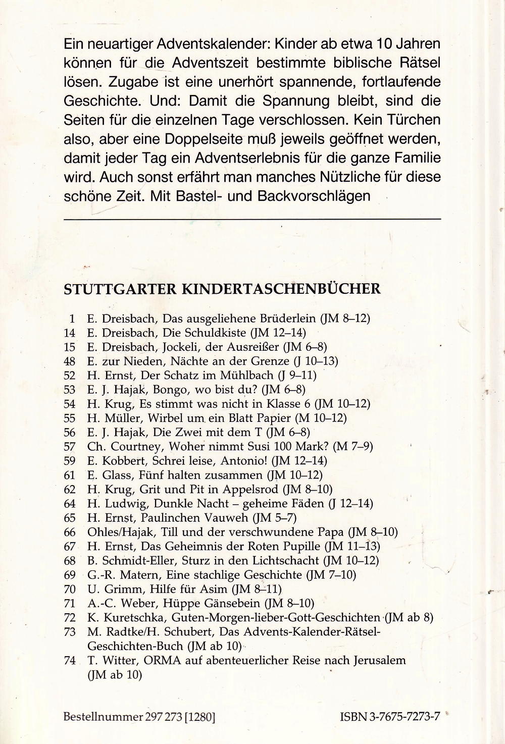 Ein neuartiger Adventskalender: Kinder ab etwa 10 Jahren können für die Adventszeit bestimmte biblische Rätsel lösen. Zugabe ist eine unerhört spannende, fortlaufende Geschichte. Und: Damit die Spannung bleibt, sind die Seiten für die einzelnen Tage verschlossen. Kein Türchen also, aber eine Doppelseite muss jeweils geöffnet werden, damit jeder Tag ein Adventserlebnis für die ganze Familie wird. Auch sonst erfährt man manches Nützliche für diese schöne Zeit. Mit Bastel- und Backvorschlägen