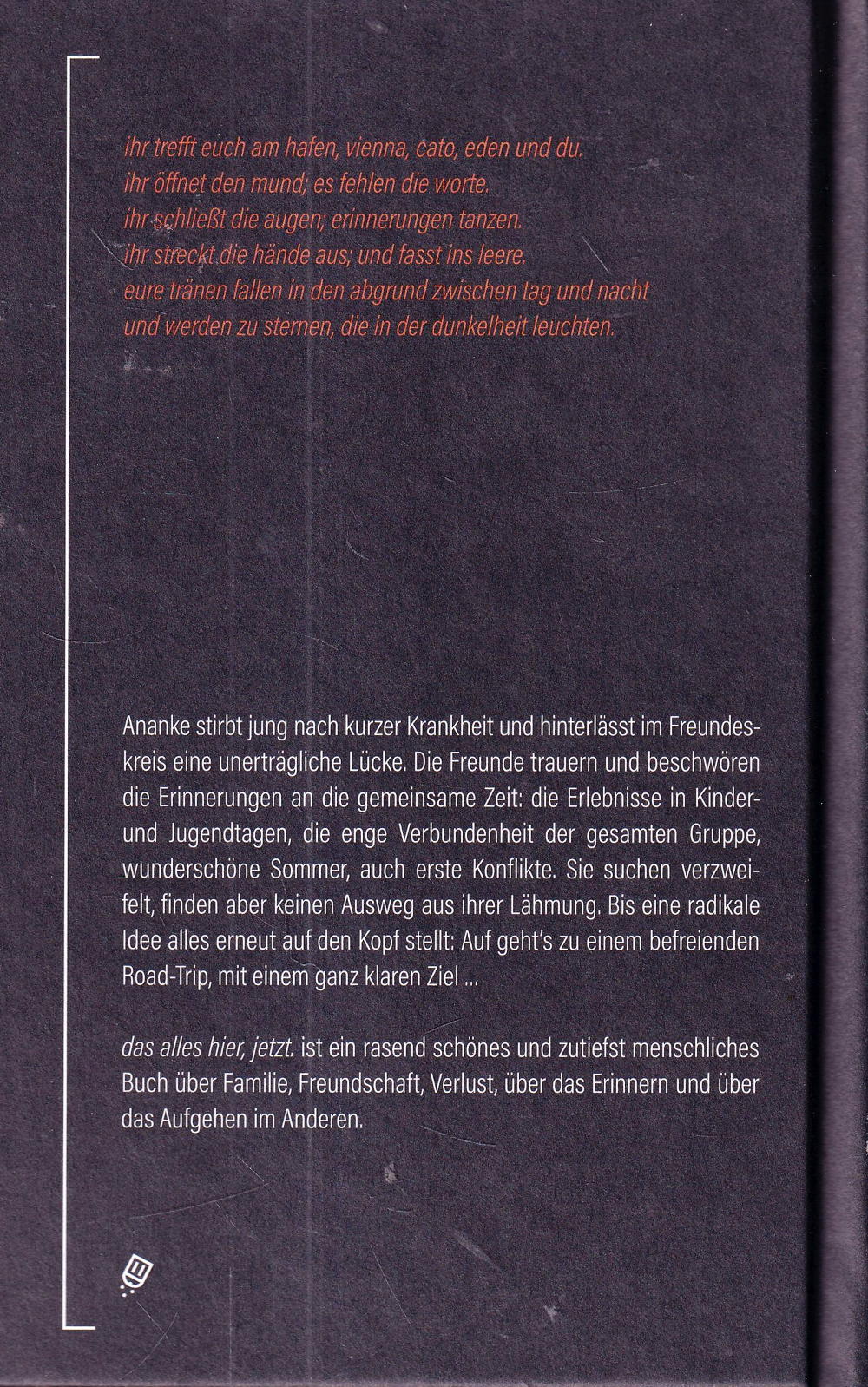 »das alles hier, jetzt.« handelt vom Umgang mit dem Tod einer eng befreundeten Person und einer Reise quer durch Raum und Zeit. Stern beschreibt eindringlich die Ohnmacht in den Wochen nach dem Tod und den Sog des Erinnerns, der die Vergangenheit festhalten will, bevor die Erzählung in einer unerhörten Befreiungsaktion aus der Trauer mündet.Ananke stirbt jung nach kurzer Krankheit und hinterlässt im Freundeskreis eine unerträgliche Lücke. Sie trauern und beschwören die Erinnerungen an die gemeinsame Zeit: die Erlebnisse in Kinder- und Jugendtagen, die enge Verbundenheit der gesamten Gruppe, wunderschöne Sommer, auch erste Kon ikte. Die Freunde suchen verzweifelt, finden aber keinen Ausweg aus ihrer Lähmung. Bis eine radikale Idee alles erneut auf den Kopf stellt: Auf geht's zu einem befreienden Road-Trip, mit einem ganz klaren Ziel ...In jeweils kurzen Fragmenten des Jetzt und der Vergangenheit kontrastiert Anna Stern die trauernden Freunde mit der schillernden Welt der guten Erinnerungen, die durch geschlechtsneutrale, unbekannte Vornamen immer auch leicht entrückt wirkt. Im zweiten Teil des Romans, der linear erzählt wird und der Bewegung entsprechend Tempo aufnimmt, entdeckt der Leser eine bisher unbekannte erzählerische Seite von Anna Stern.das alles hier, jetzt.« ist ein rasend schönes und zutiefst menschliches Buch über Familie, Freundschaft und Verlust, über das Erinnern und Aufgehen im Anderen, und ein weiterer Meilenstein im Schaffen einer der bemerkenswertesten Autorinnen der Schweiz.