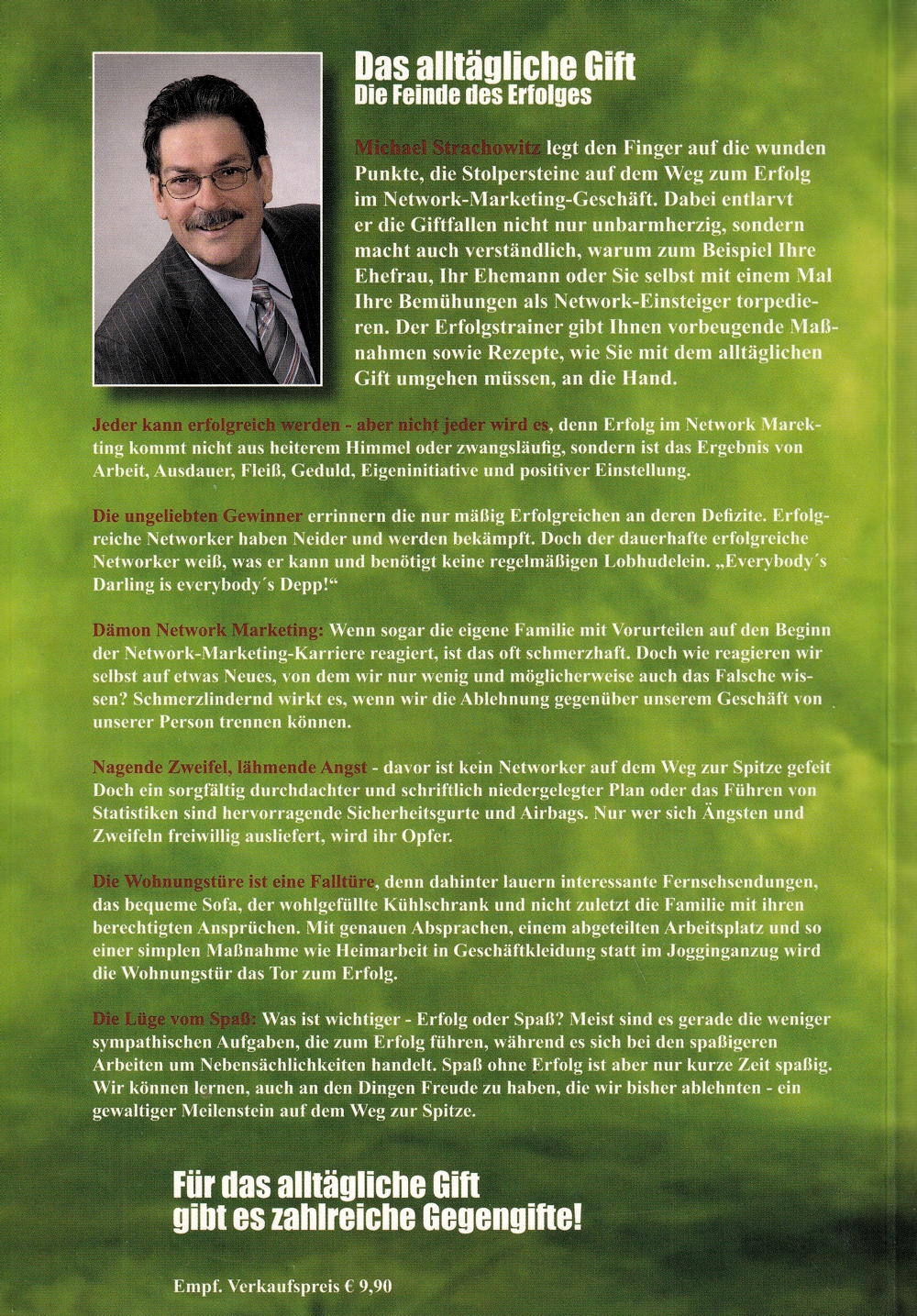 Michael Strachowitz legt den Finger auf die wunden Punkte, die Stolpersteine auf dem Weg zum Erfolg im Network-Marketing-Geschäft. Dabei entlarvt er die Giftfallen nicht nur unbarmherzig, sondern macht auch verständlich, warum zum Beispiel Ihre Ehefrau, Ihr Ehemann oder Sie selbst mit einem Mal Ihre Bemühungen als Network-Einsteiger torpedieren. Der Erfolgstrainer gibt Ihnen vorbeugende Massnahmen sowie Rezepte, wie Sie mit dem alltäglichen Gift umgehen müssen, an die Hand.