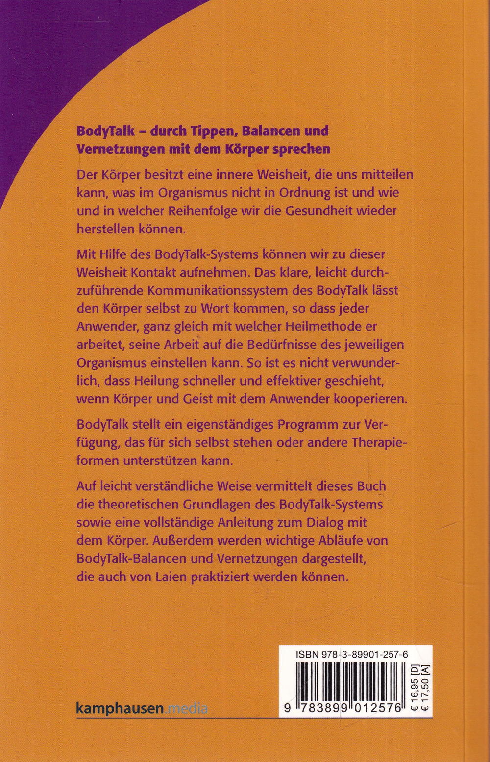 Der Körper besitzt eine innere Weisheit, die uns mitteilen kann, was im Organismus nicht in Ordnung ist und wie und in welcher Reihenfolge wir die Gesundheit wieder herstellen können. Mit Hilfe des BodyTalk Systems(TM) können wir zu dieser Weisheit Kontakt aufnehmen. Das klare, leicht durchzuführende Kommunikationssystem des BodyTalk lässt den Körper selbst zu Wort kommen, so dass jeder Anwender, ganz gleich mit welcher Heilmethode er arbeitet, seine Arbeit auf die Bedürfnisse des jeweiligen Organismus einstellen kann. So ist es nicht verwunderlich, dass Heilung schneller und effektiver geschieht, wenn Körper und Geist mit dem Anwender kooperieren. BodyTalk stellt ein eigenständiges Programm zur Verfügung, das für sich selbst stehen oder andere Therapieformen unterstützen kann. Auf leicht verständliche Weise vermittelt dieses Buch die theoretischen Grundlagen des BodyTalk Systems(TM) sowie eine vollständige Anleitung zum Dialog mit dem Körper. Ausserdem werden wichtige Abläufe von BodyTalk-Balancen und Vernetzungen dargestellt, die auch von Laien praktiziert werden können.