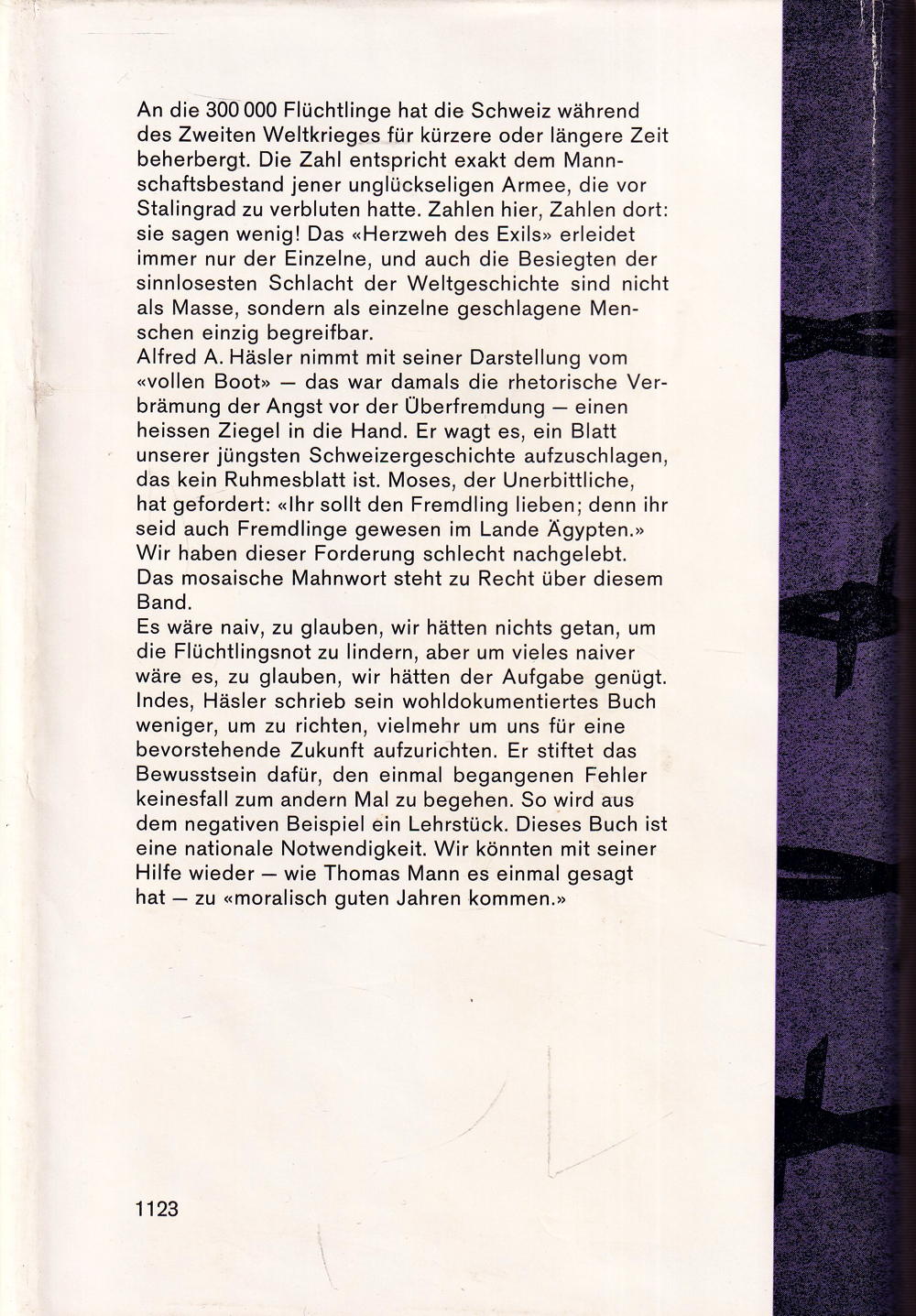 Indes, Häsler schrieb sein wohldokumentiertes Buch weniger, um zu richten, vielmehr um uns für eine bevorstehende Zukunft aufzurichten. Er stiftet das Bewusstsein dafür, den einmal begangenen Fehler keinesfall zum andern Mal zu begehen. So wird aus dem negativen Beispiel ein Lehrstück. Dieses Buch ist eine nationale Notwendigkeit. Wir könnten mit seiner Hilfe wieder – wie Thomas Mann es einmal gesagt hat - zu «moralisch guten Jahren kommen. »
