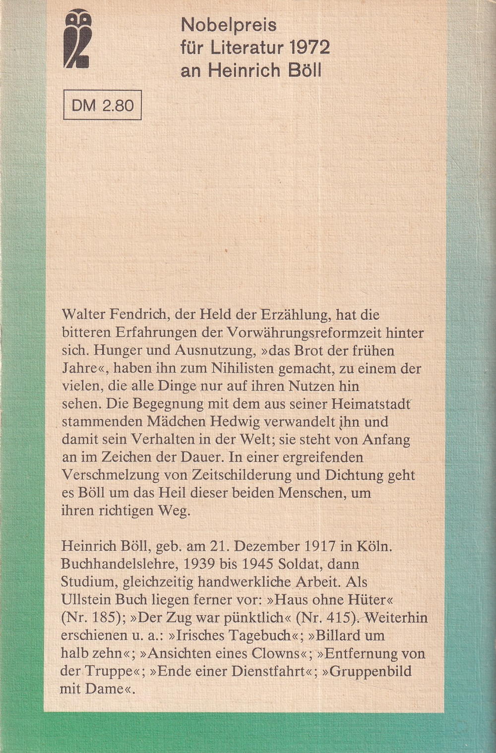 Walter Fendrich, der Held der Erzählung, hat die bitteren Erfahrungen der Vorwährungsreformzeit hinter sich. Hunger und Ausnutzung, »das Brot der frühen Jahre«, haben ihn zum Nihilisten gemacht, zu einem der vielen, die alle Dinge nur auf ihren Nutzen hin sehen. Die Begegnung mit dem aus seiner Heimatstadt stammenden Mädchen Hedwig verwandelt ihn und damit sein Verhalten in der Welt; sie steht von Anfang an im Zeichen der Dauer. In einer ergreifenden Verschmelzung von Zeitschilderung und Dichtung geht es Böll um das Heil dieser beiden Menschen, um ihren richtigen Weg.