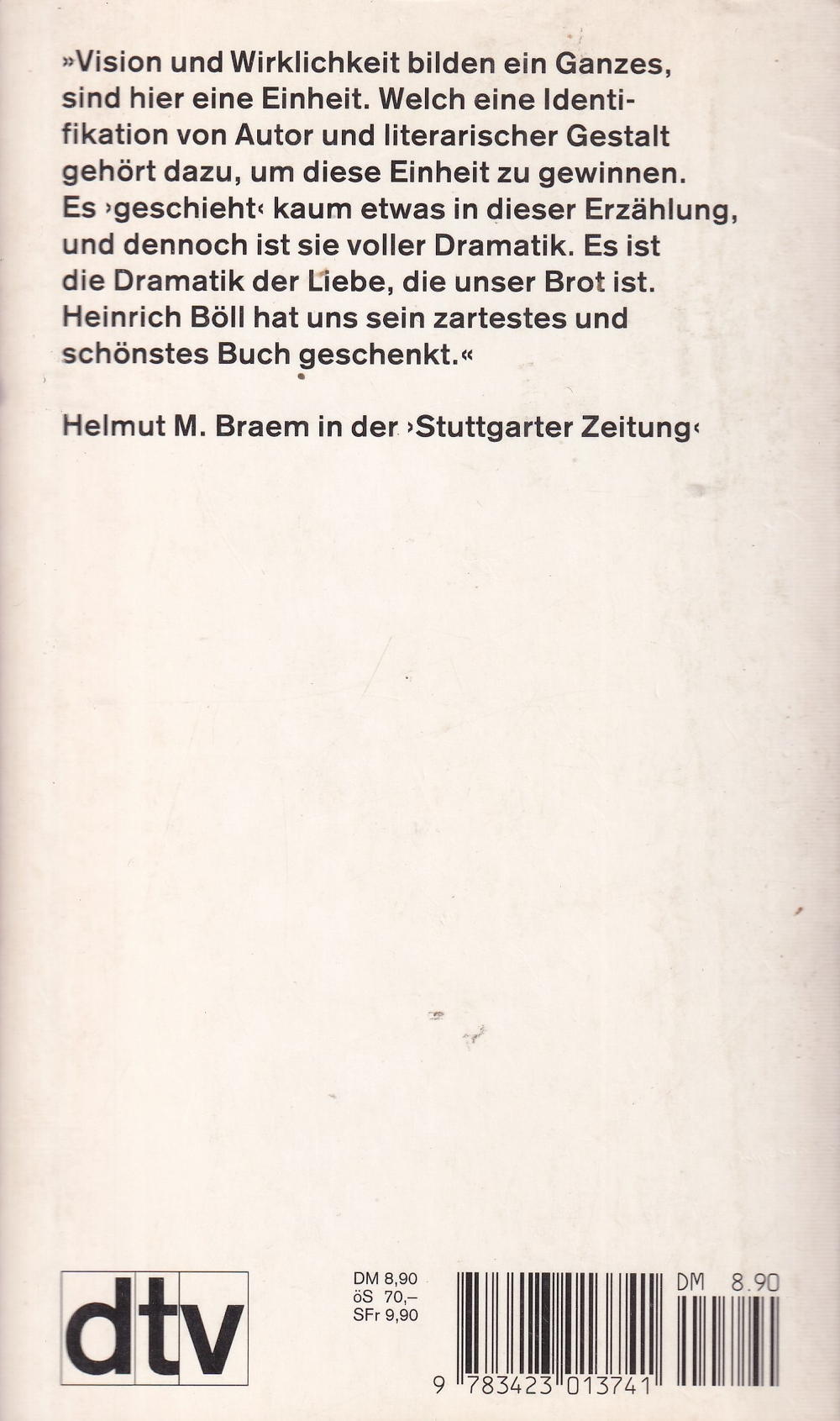 »Vision und Wirklichkeit bilden ein Ganzes, sind hier eine Einheit. Welch eine Identifikation von Autor und literarischer Gestalt gehört dazu, um diese Einheit zu gewinnen. Es geschieht kaum etwas in dieser Erzählung, und dennoch ist sie voller Dramatik. Es ist die Dramatik der Liebe, die unser Brot ist. Heinrich Böll hat uns sein zartestes und schönstes Buch geschenkt. «