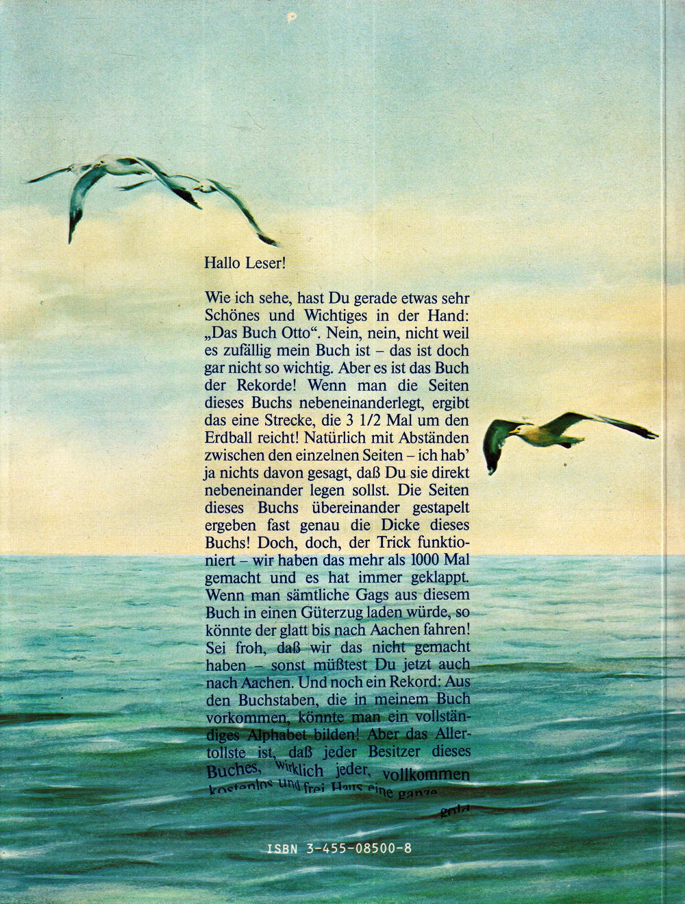 „Das Buch Otto“。Nein, nein, nicht weil es zufällig mein Buch ist - das ist doch gar nicht so wichtig. Aber es ist das Buch der Rekorde! Wenn man die Seiten dieses Buchs nebeneinanderlegt, ergibt das eine Strecke, die 3 1/2 Mal um den Erdball reicht! Natürlich mit Abständen zwischen den einzelnen Seiten - ich hab'