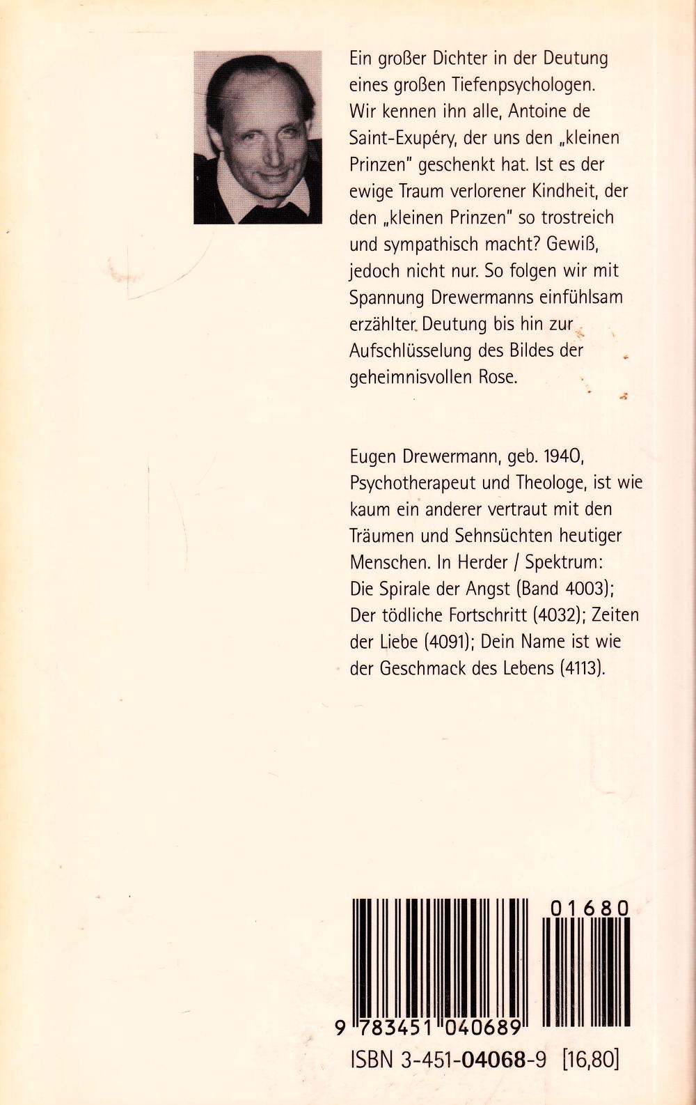 Wir kennen ihn alle, Antoine de Saint-Exupéry, der uns den „kleinen Prinzen" geschenkt hat. Ist es der ewige Traum verlorener Kindheit, der den „kleinen Prinzen" so trostreich und sympathisch macht? Gewiss, jedoch nicht nur. So folgen wir mit Spannung Drewermanns einfühlsam erzählter. Deutung bis hin zur Aufschlüsselung des Bildes der geheimnisvollen Rose.