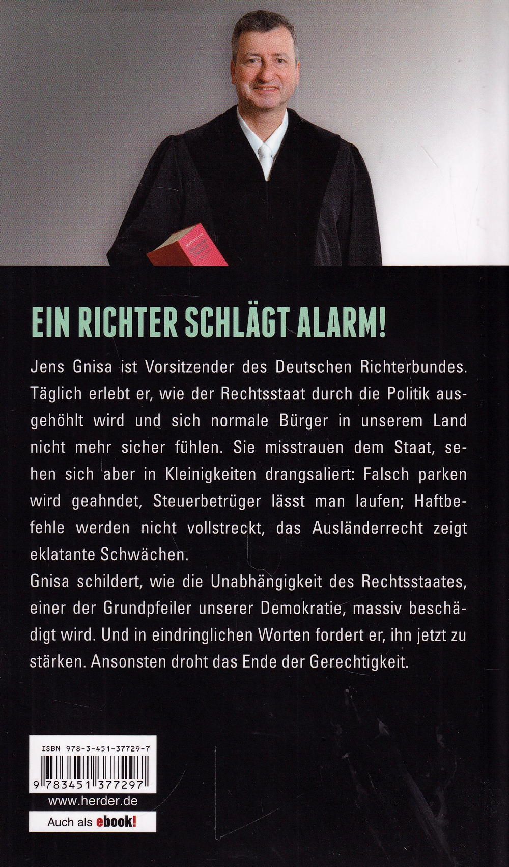 Denn täglich erlebt er, wie der Rechtsstaat durch die Politik ausgehöhlt wird und sich normale Bürger in unserem Land nicht mehr sicher fühlen. Sie misstrauen dem Staat, sehen sich aber in Kleinigkeiten drangsaliert: Falsch parken wird geahndet, Steuerbetrüger lässt man laufen; Haftbefehle werden nicht vollstreckt, das Ausländerrecht zeigt eklatante Schwächen. Gnisa schildert, wie die Unabhängigkeit des Rechtsstaates, einer der Grundpfeiler unserer Demokratie, durch mangelnde innere Sicherheit, Rechtsverstösse durch die Politik und populistische Ausweichmanöver, wenn es um die Verantwortung für die Bürger dieses Landes geht, massiv beschädigt wird. All dies erfahren nicht nur Richter bei ihrer täglichen Arbeit, auch Staats- und Rechtsanwälte und Justizangestellte. Sie bekommen nicht selten Hassmails und Todesdrohungen, weil sie tun, was zu ihren Aufgaben gehört: Urteile sprechen, Ansprüche vertreten, Recht und Gesetz Geltung verschaffen. Können sie es bald schon niemandem mehr recht machen? Und was bedeutet das dann?