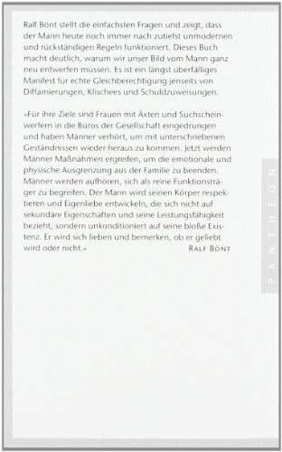 Ralf Bönt hat sich vorgenommen, die Rolle des modernen Mannes zu hinterfragen, zu untergraben, auseinanderzunehmen. Unser Bild vom Mann werden wir uns nach Lektüre dieses Buchs ganz neu zusammensetzen müssen. Bönts Buch ist ein längst überfälliges Plädoyer für echte Gleichberechtigung jenseits von Diffamierungen, Klischees und Schuldzuweisungen. Der Feminismus hat als revolutionäre Bewegung unsere Gesellschaft verändert. Er forderte die Gleichberechtigung der Frauen und hat zweifelsohne viel erreicht. Aber jetzt ist er in der Sackgasse. Ohne einen Beitrag der Männer kann sein Ziel nicht erreicht werden. Es ist daher höchste Zeit, dass Männer über sich nachdenken und ihre eigenen Ansprüche an eine antisexistische Gesellschaft formulieren. Wenn sie endlich reden und wir endlich zuhören, erfahren wir, dass Männer im Alter bedauern, zu wenig Zeit mit ihren Kindern verbracht zu haben. Sie haben sich zu stark über ihre Arbeitsleistung verstanden und zu wenig auf sich geachtet. Nun wollen sie sorgsamer mit sich selbst umgehen, fordern das Recht auf ein karrierefreies Leben, das Recht auf Krankheit, das Recht auf eine geehrte Sexualität jenseits von Diffamierung und Kapitalisierung. Männer sollen die Möglichkeit haben, das Leben zu wählen, das sie sich wünschen, statt sich in allen Kontexten aufs reine Funktionieren reduzieren zu lassen. Mit einem untrüglichen Blick für Details und grossem Respekt für die historische Leistung des Feminismus seziert Ralf Bönt die unbefriedigende Lage, in der sich Männer und Frauen momentan befinden. Kompromisslos verlangt er die Befreiung des Mannes aus seinem engen Selbstverständnis und immer gleichen Lebensentwurf.
