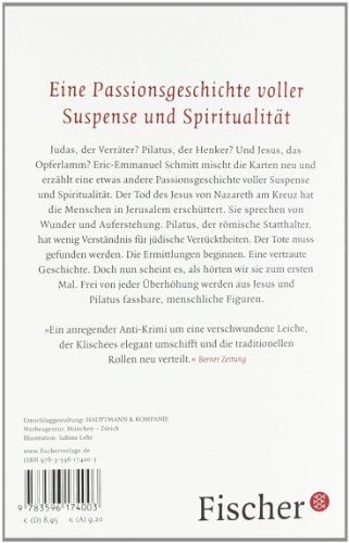 Ein Mann im Garten am Ölberg, allein, am Vorabend seiner Verhaftung. Die Worte der Mutter klingen ihm noch im Ohr: »Jemand, der liebt wie du, wird leiden müssen. « Ein schlechter Jude, ein schlechter Zimmermann. Er wartet auf die Soldaten, die ihn holen und abführen werden. Er wartet auf seine Hinrichtung. Ein anderer Mann, ein anderer Ort. Vielleicht fünfzehn Verhaftungen, nur drei Kreuzigungen, es hätten geruhsame Feiertage für ihn werden können. Doch dann verschwindet die Leiche eines der gekreuzigten Männer. Ganz Jerusalem ist erschüttert, die Menschen sprechen von Wunder und Auferstehung, manche sagen, der Gekreuzigte sei ihnen erschienen, oder man habe zumindest davon gehört. Pilatus hat wenig Verständnis für die jüdischen Verrücktheiten, die Lage muss beruhigt, der Tote muss gefunden werden, die Ermittlungen beginnen. Judas, der Verräter, Pilatus, der Henker, und Jesus das Opferlamm? – vergessen wir diese Rollenfestschreibung. Schmitt befreit die Protagonisten der Passionsgeschichte von jeder Überhöhung oder Vorverurteilung, haucht ihnen mit frischer Feder neues Leben ein und erzählt uns eine sehr vertraute Geschichte so spannend und neu, als hörten wir sie zum ersten Mal.