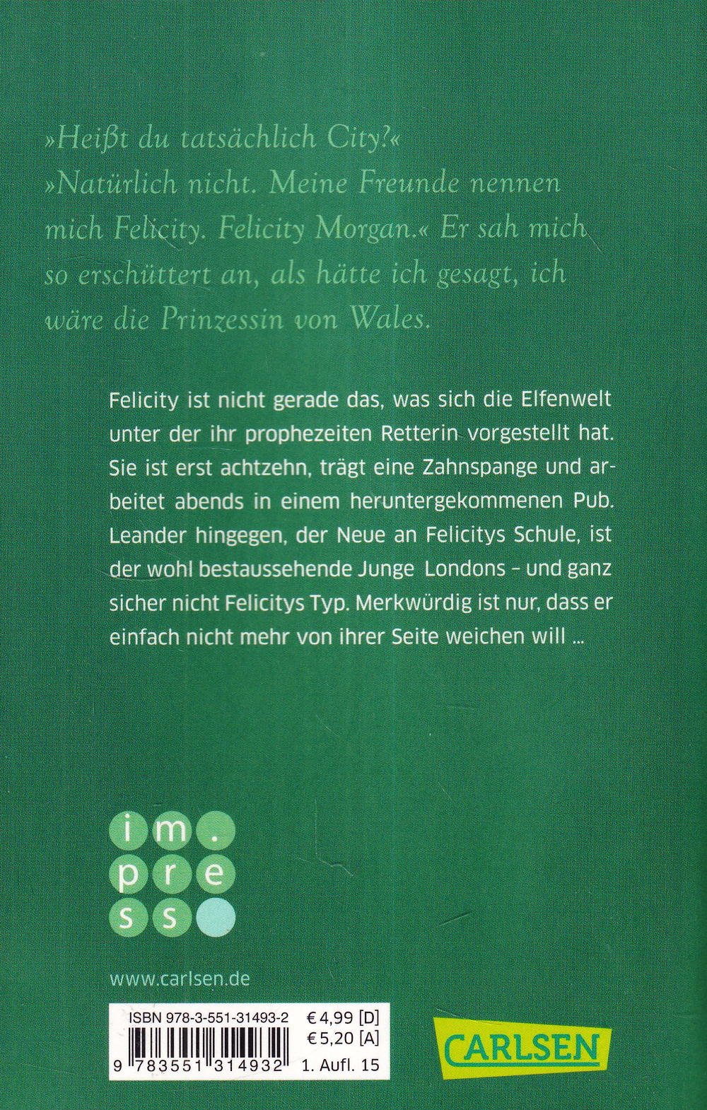 Felicity Morgan ist nicht gerade das, was sich die Elfenwelt unter ihrer prophezeiten Retterin vorgestellt hat. Sie ist achtzehn, trägt immer noch eine Zahnspange, hat keinen Sinn für schicke Klamotten und scheint niemals genügend Schlaf zu bekommen. Leander FitzMor hingegen, der Neue an Felicitys Schule, ist der wohl mit Abstand bestaussehendste Typ Londons. Um keinen coolen Spruch verlegen und zu allem Überfluss auch noch intelligent - denkt Felicity, die Gott sei Dank nicht auf arrogante Frauenschwärme steht. Auch wenn diesen Leander immer jener seltsam anziehende Duft nach Heu und Moos umgibt und er sie manchmal anschaut, als könne er ihre Gedanken lesen. Aber das Schlimmste an dem Ganzen ist, dass er einfach nicht mehr von ihrer Seite weichen will ...